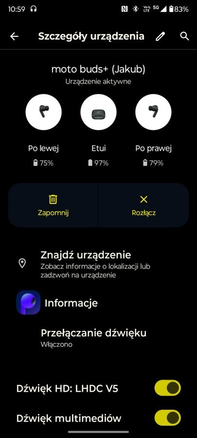 Za komunikację słuchawek z naszymi urządzeniami odtwarzającymi odpowiada interfejs Bluetooth 5.3 z obsługą podstawowych kodeków SBC i AAC oraz wysokojakościowego LHDC 5.0 – pod kątem technicznym, w Moto Buds+ zapewnia on dźwięk o parametrach 24-bit/96 kHz przy bitrate wynoszącym maksymalnie 1 Mb/s. To właśnie dzięki niemu producent chwali się tu dźwiękiem Hi-Res