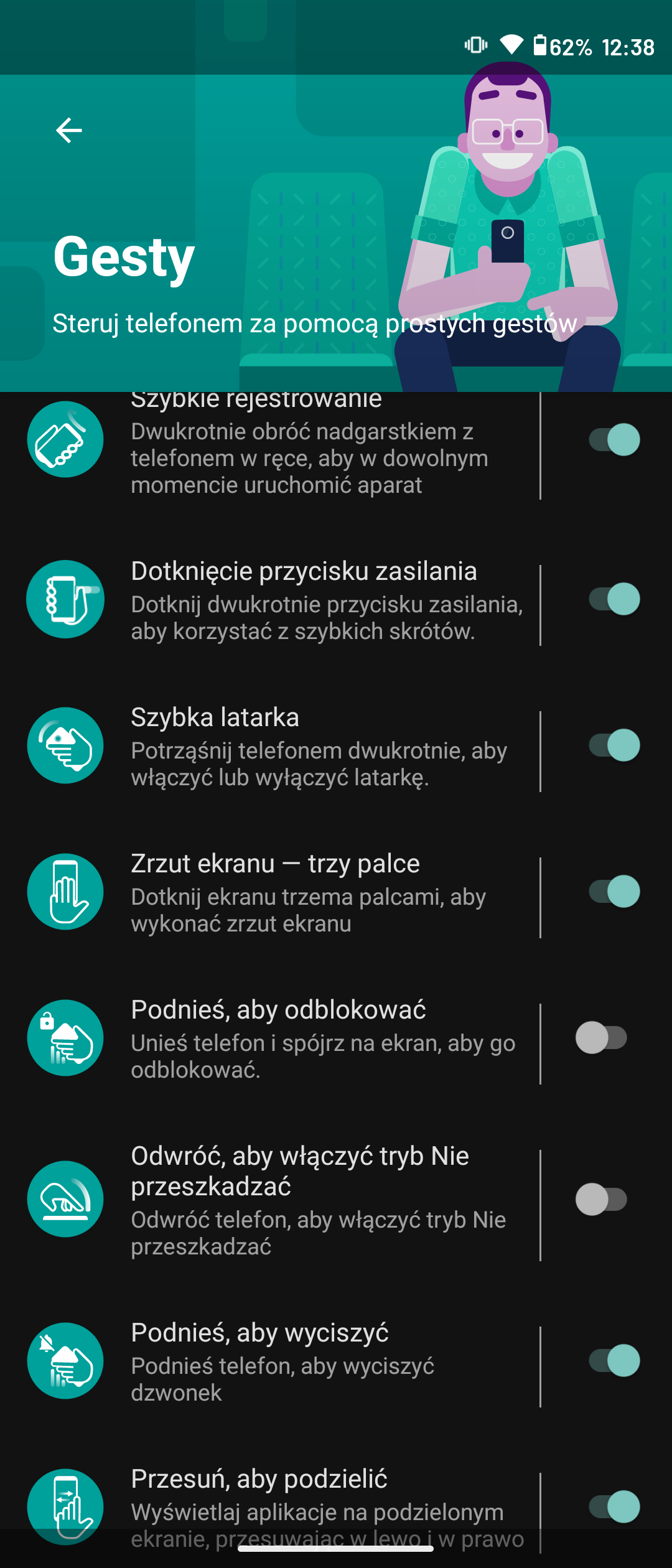 Przechodząc do bardzo lubianych przez użytkowników gestów, dostajemy aż 8 propozycji. Jest włączanie latarki dwukrotnym potrząśnięciem, jest też włączenie aparatu przez obrót smartfona. Nie brakuje także robienia screenów przy użyciu trzech palców i wyciszenia dzwonka po położeniu telefonu ekranem do dołu. Jest więc wszystko to, za co użytkownicy polubili gesty Moto.