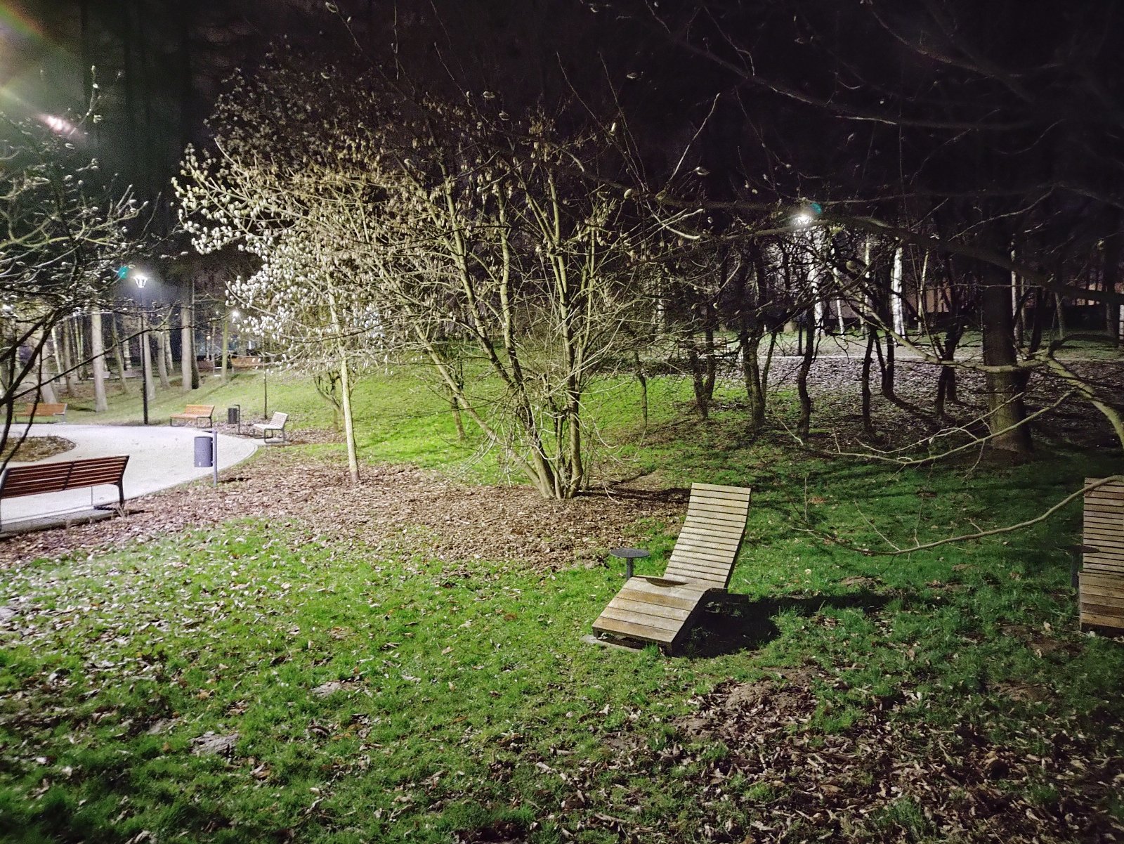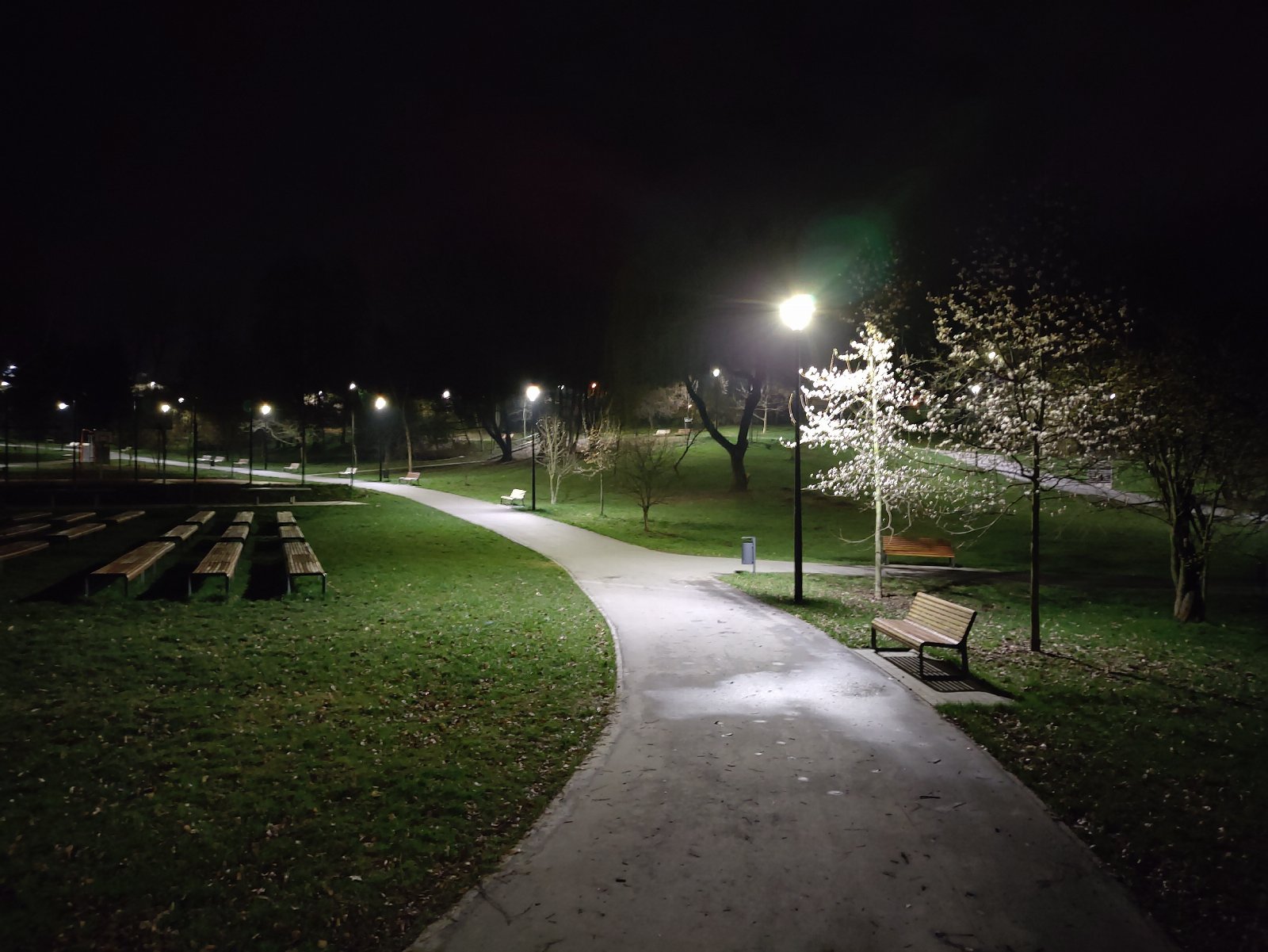 Jest dedykowany tryb nocny, jednakże z niego możemy skorzystać wyłącznie w przypadku obiektywu głównego. Poprawia on odrobinę szczegółowość zdjęć. To, na co należy zwrócić uwagę to fakt, że tryb działa bardzo agresywnie i znacząco rozjaśnia nawet najciemniejsze fotografie. Może się to podobać, jednakże rezultatom daleko od tego, co w rzeczywistości. Zdjęcia potrafią wyglądać, jakby uwieczniane miejsca były doświetlane lampą. Czuć brak optycznej stabilizacji obrazu (OIS), gdyż nawet niewielkie poruszenie smartfonem potrafi skutkować całkiem rozmytą fotografią.