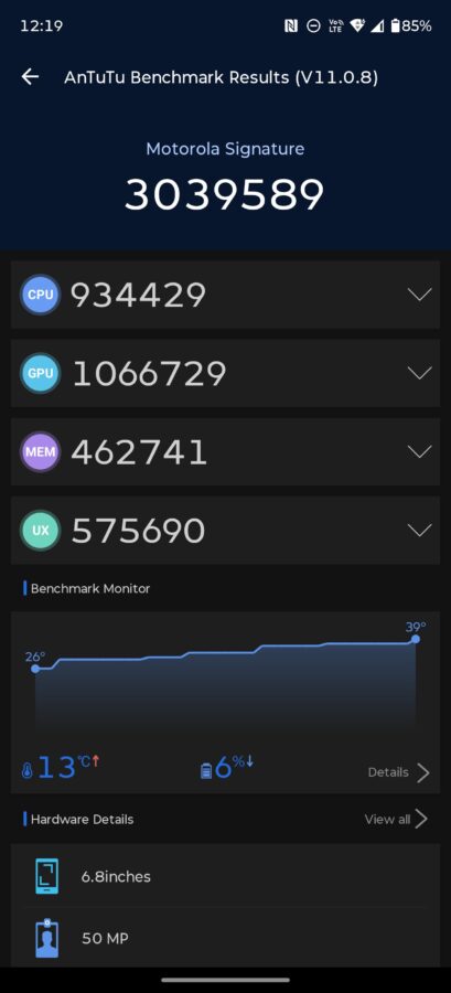 Zazwyczaj, Motorola Signature jest zupełnie chłodna i w zasadzie jedyną sytuacją, w której czułem wzrost temperatury, było dłuższe korzystanie z telefonu na 5G, choć i tak był on wtedy najwyżej lekko cieplejszy. Bardziej grzał się już tylko przy ładowaniu i benchmarkach, ale to akurat żadne zaskoczenie.