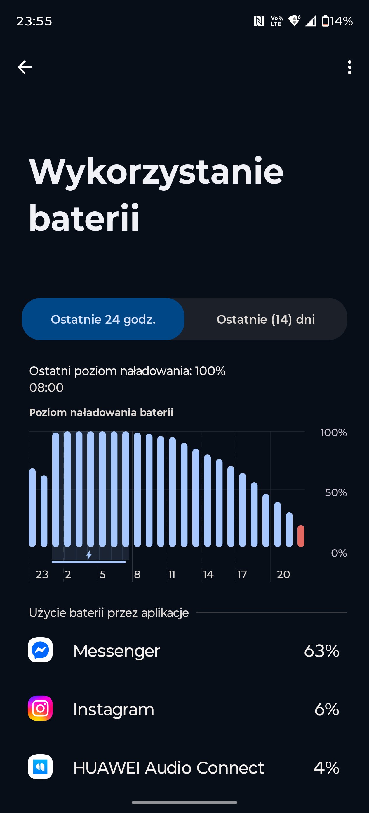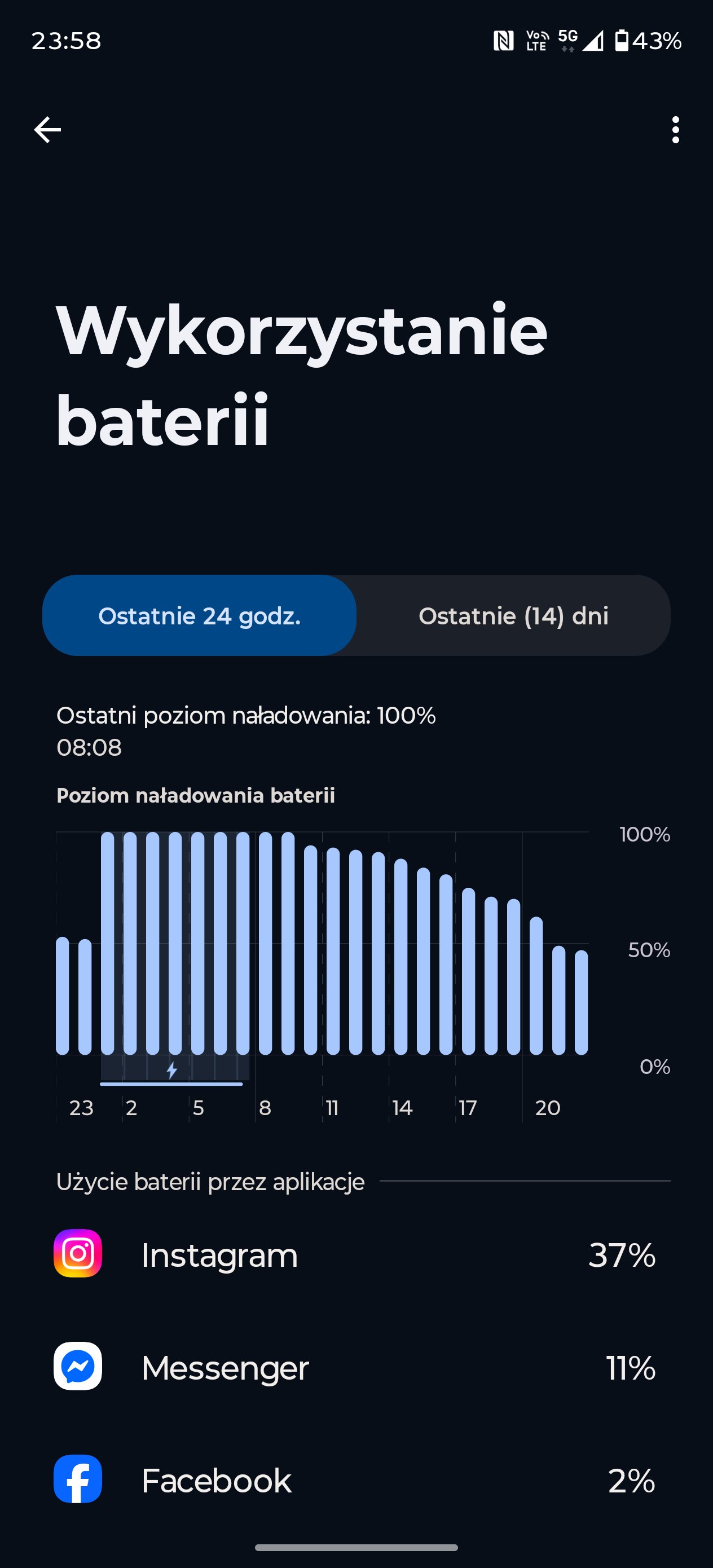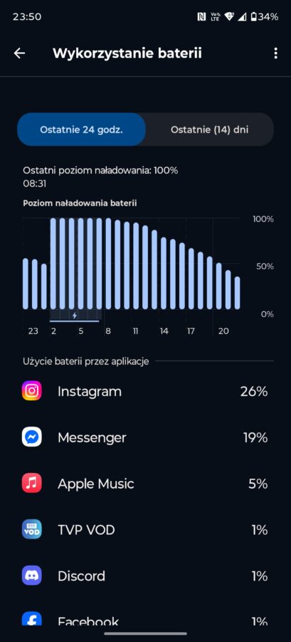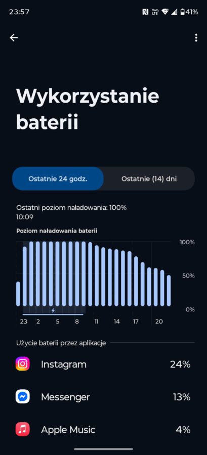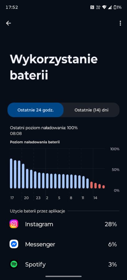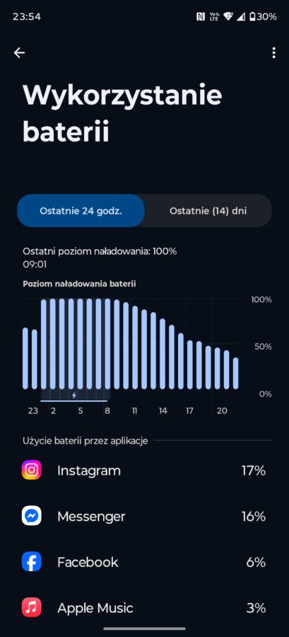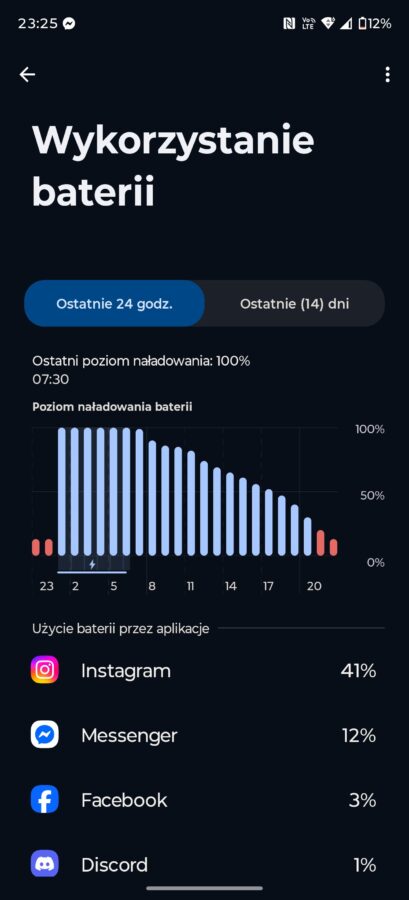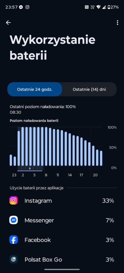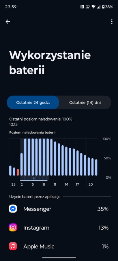 Gdy użytkowanie było nieco mniej intensywne i przeważało wykorzystanie WiFi, telefon odłączony rano, przed północą potrafił kończyć dzień mając jeszcze około 30-35% baterii. Nie był to jednak wówczas zapas pozwalający na używanie telefonu kolejnego dnia, bo rozładowywał się wtedy już o 15:00.