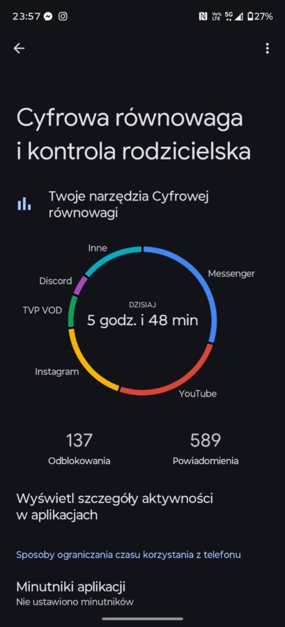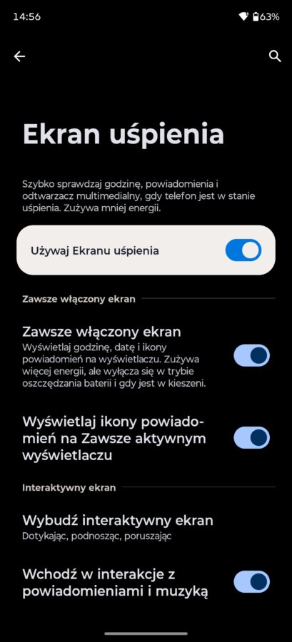 I druga kwestia – Always On Display wyświetla się wyłącznie w formie prostej, czyli na czarnym tle, bez przygaszonej tapety. Jest tu też doskonale znany z innych smartfonów Motoroli tzw. ekran uśpienia, który aktywuje się po dotknięciu wyświetlacza lub poruszeniu telefonem, stanowiący coś w rodzaju bardziej przygaszonego ekranu blokady.