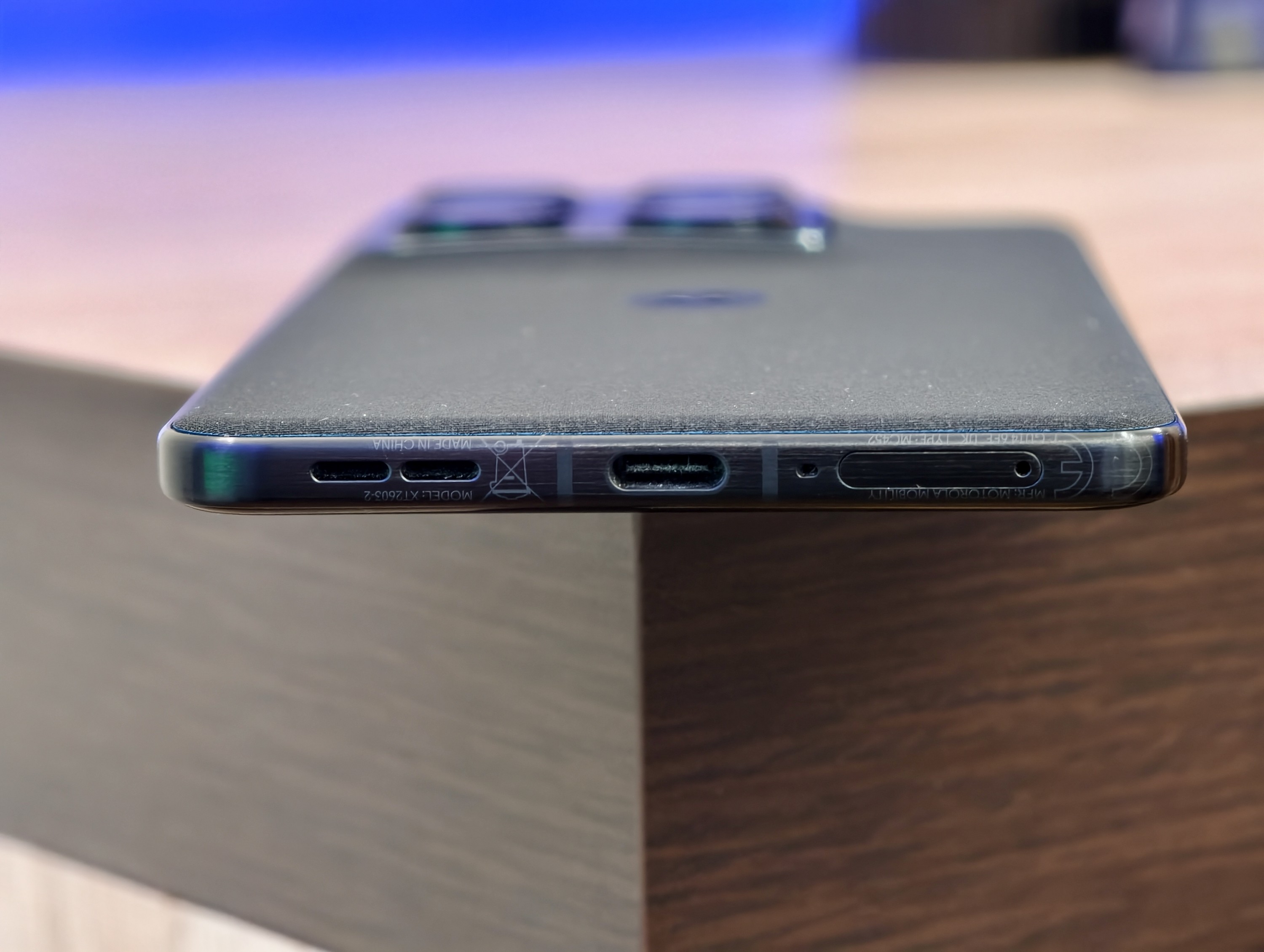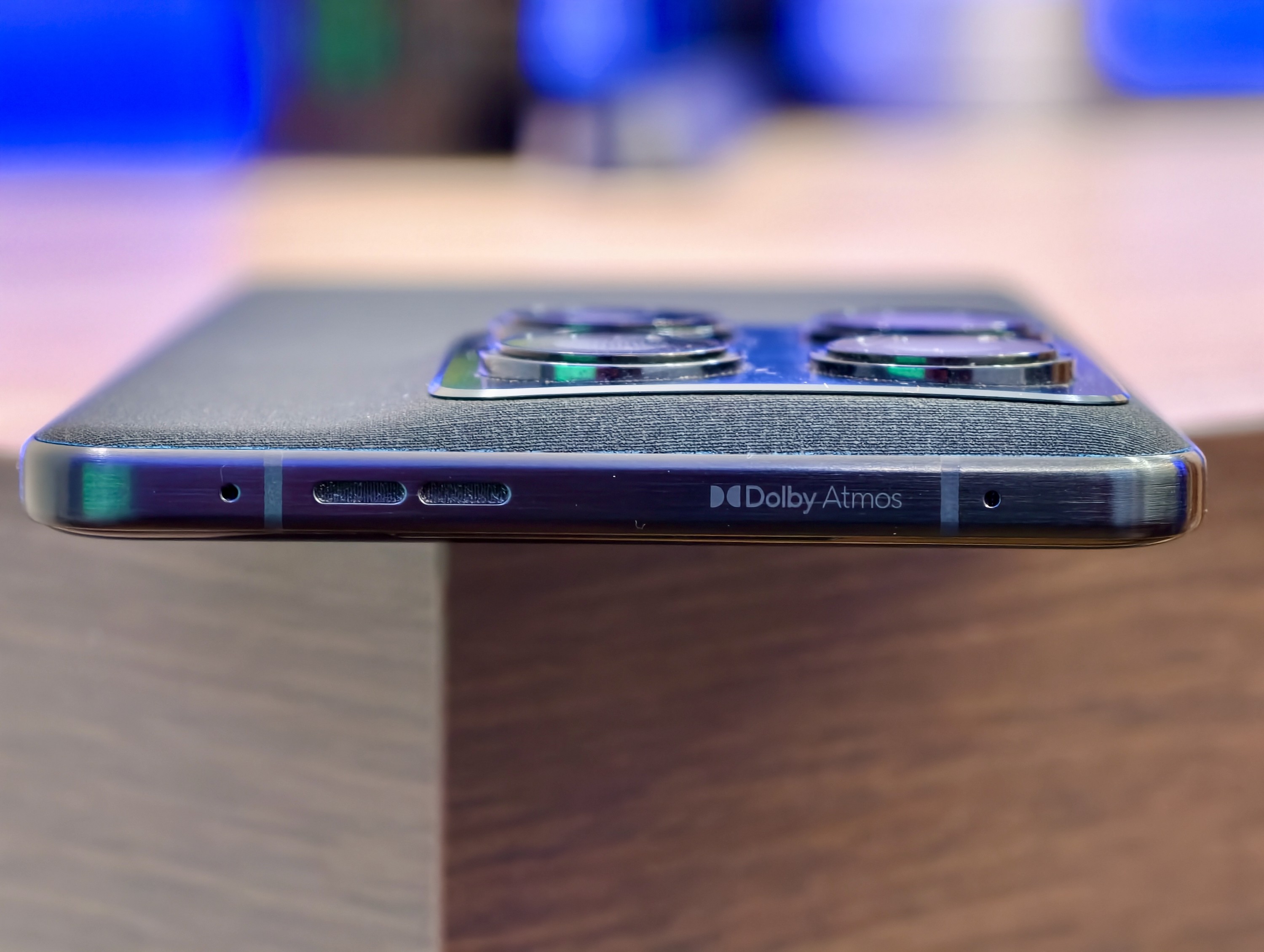 U góry znalazła się maskownica jednego z głośników oraz sygnowanie Dolby Atmos, a na dole slot nanoSIM, port USB-C i drugi głośnik. Po lewej stronie umieszczono przycisk do wywoływania Moto AI, natomiast na prawej krawędzi – klasycznie – przyciski głośności i zasilania.