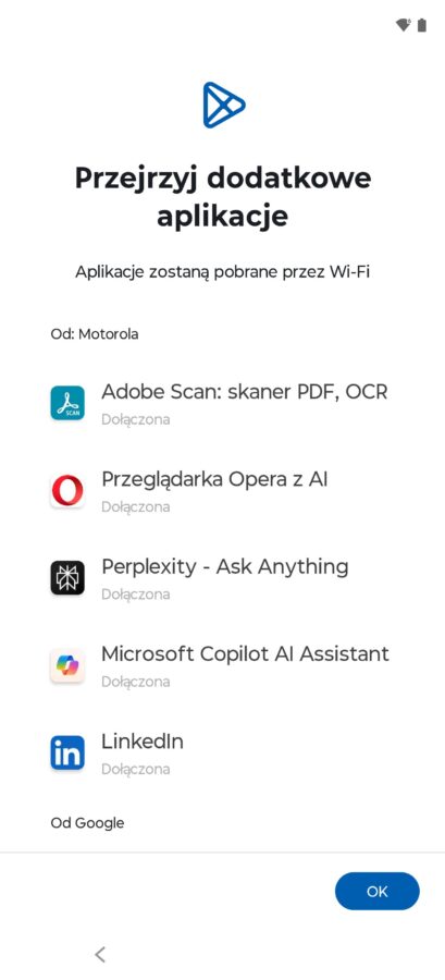 Muszę też jednak trochę ponarzekać. Nie ma tutaj co prawda ogromnej ilości preinstalowanych, zbędnych aplikacji (tych polecanych przez Motorolę jest pięć, w tym żadnych śmieciowych gier), a już z pewnością jest ich mniej niż w innych smartfonach marki. Niemniej, kompletnie nie rozumiem, dlaczego podczas konfiguracji system wyświetla nam listę tych sugerowanych apek, ale już nie pozwala nam wybrać, których z nich nie chcemy instalować.