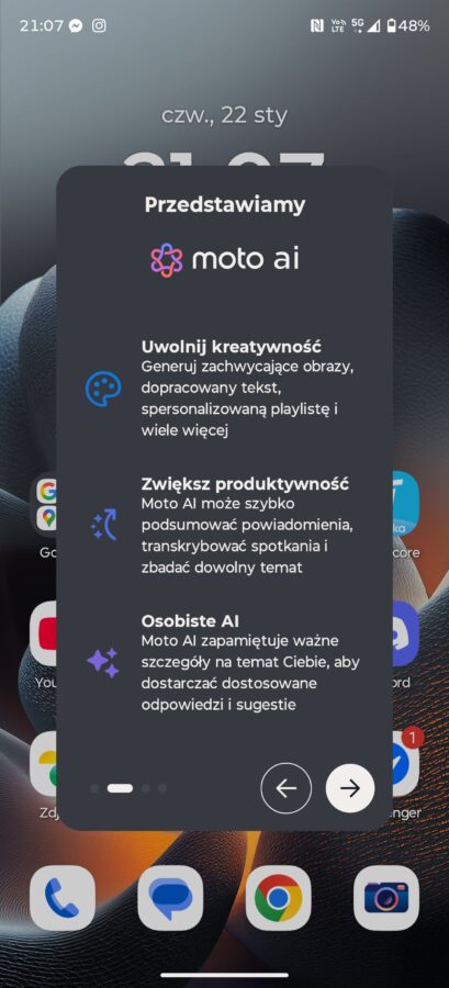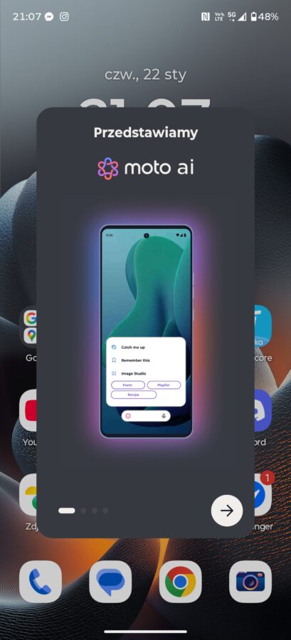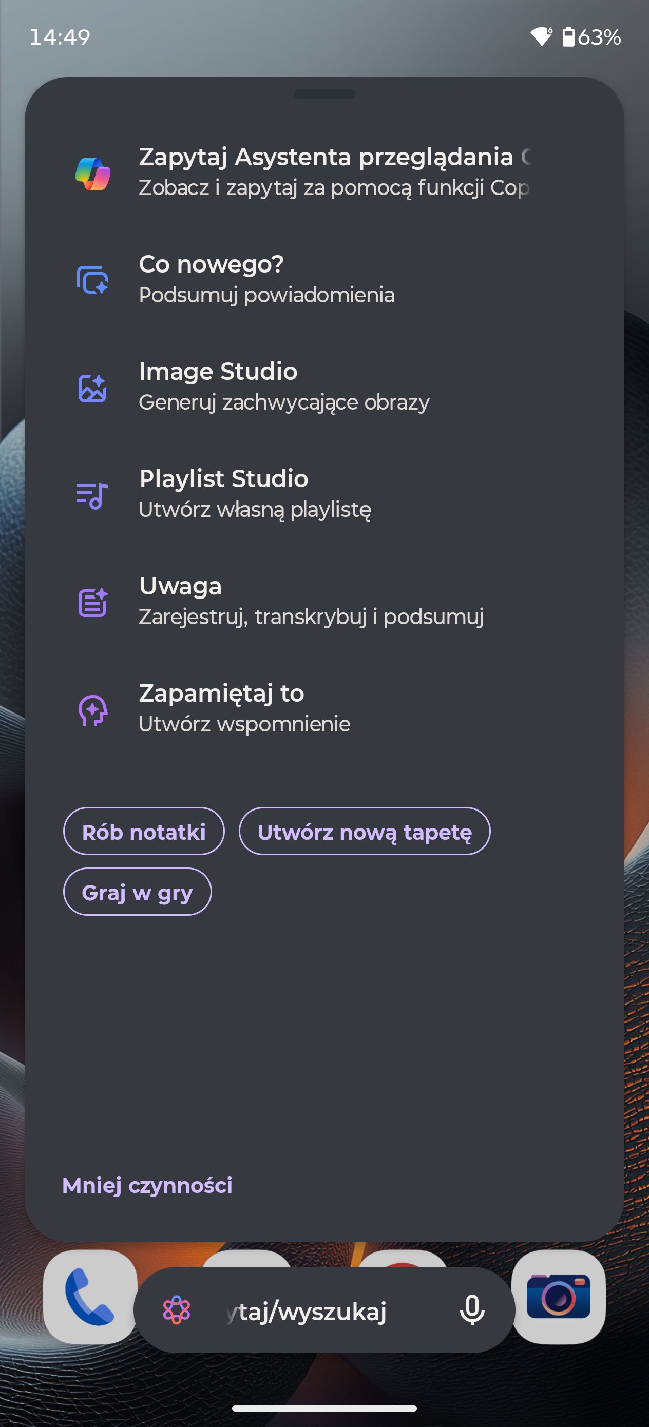 Do wywoływania Moto AI służy znajdujący się na lewej krawędzi dedykowany przycisk, który musimy przytrzymać przez chwilę (możemy też przypisać mu dodatkową interakcję pod dwukrotne naciśnięcie). Wówczas, na ekranie pokazuje nam się okno z kilkoma sugerowanymi opcjami użycia, a na samym dole pole do wprowadzenia komendy.