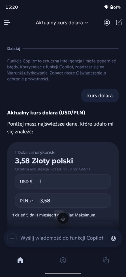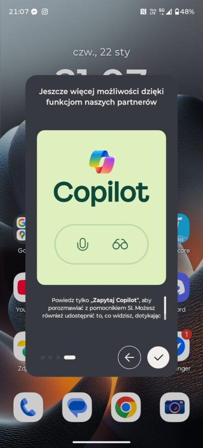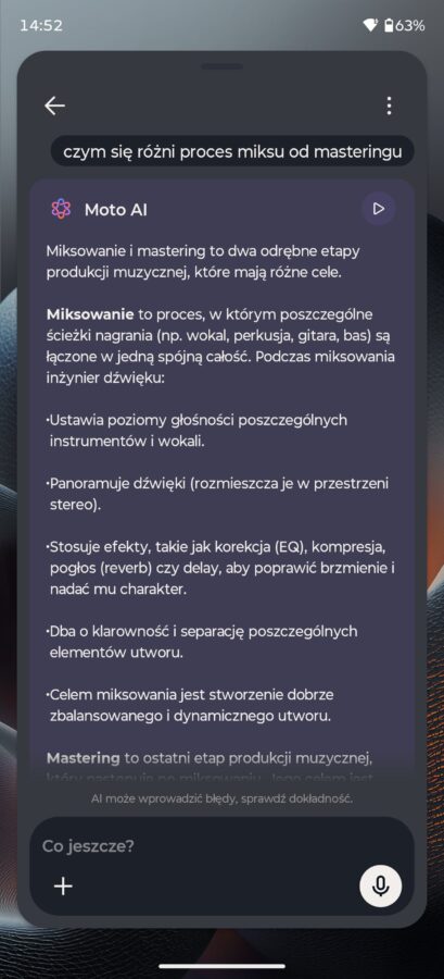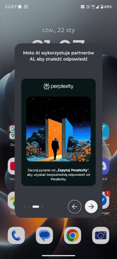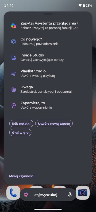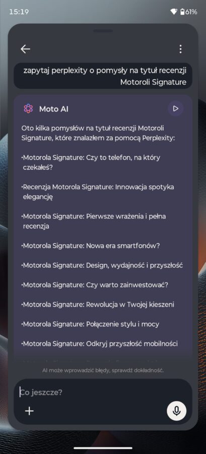 Tym, co na swój sposób wyróżnia Moto AI, jest integracja z chatbotami Microsoft Copilot oraz Perplexity. I poza tym, że możemy – po prostu – zapytać o coś bezpośrednio asystenta Motoroli, można też dodać zwrot Zapytaj Perplexity lub Zapytaj Copilot przez zapytaniem, by zostało ono zadane właśnie któremuś z tych modeli AI. Przy tym, pytając Copilota zostajemy przeniesieni do jego aplikacji.