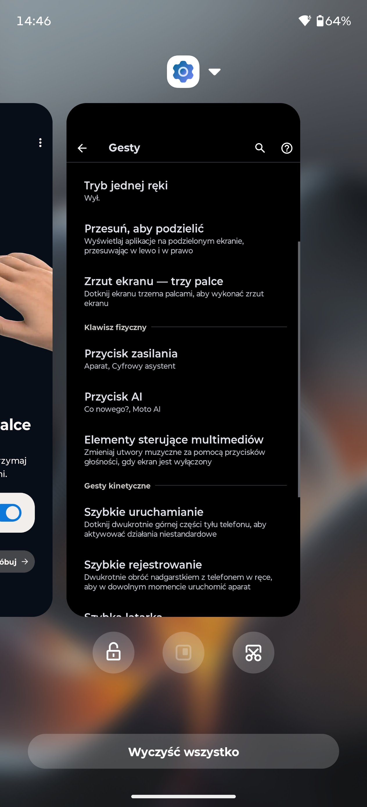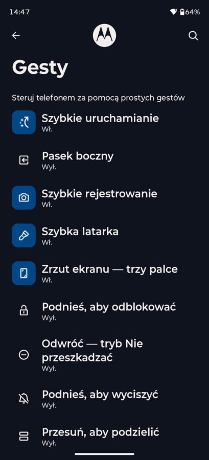 W zdecydowanej większości aspektów trudno jednoznacznie utyskiwać na całokształt oprogramowania, także pod kątem optymalizacji i płynności działania. Znalazły się tu – chociażby – dobrze znane i lubiane gesty Moto, które pozwalają np. zrobić zrzut ekranu kładąc trzy palce na ekranie, włączyć latarkę potrząsając telefonem czy otworzyć aparat obracając dłonią z telefonem.