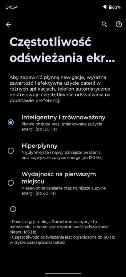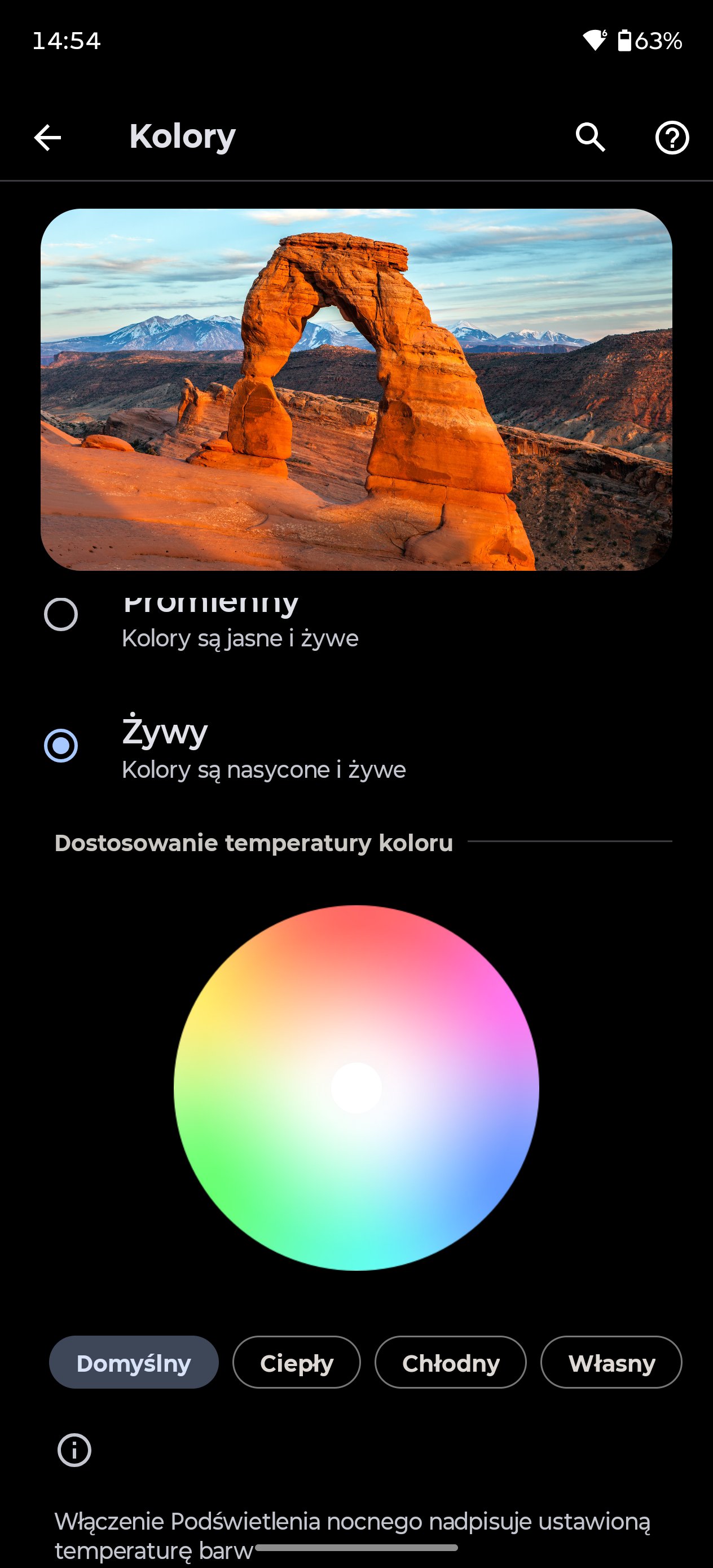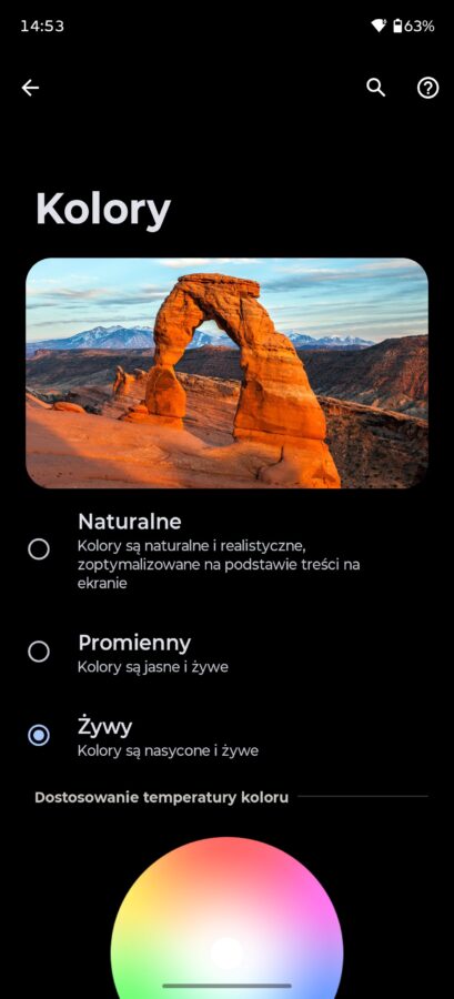 Wchodząc do sekcji ustawień wyświetlacza możemy zdecydować o sposobie wyświetlania barw, wybierając spośród trzech gotowych ustawień: naturalne, promienny oraz żywy (domyślnie ustawiony jest ostatni), a także dostosować temperaturę barwową. W aspekcie częstotliwości odświeżania dostępne są trzy opcje – adaptacyjna, stała do 120 Hz lub do 60 Hz.