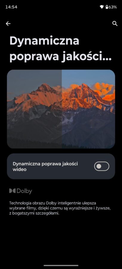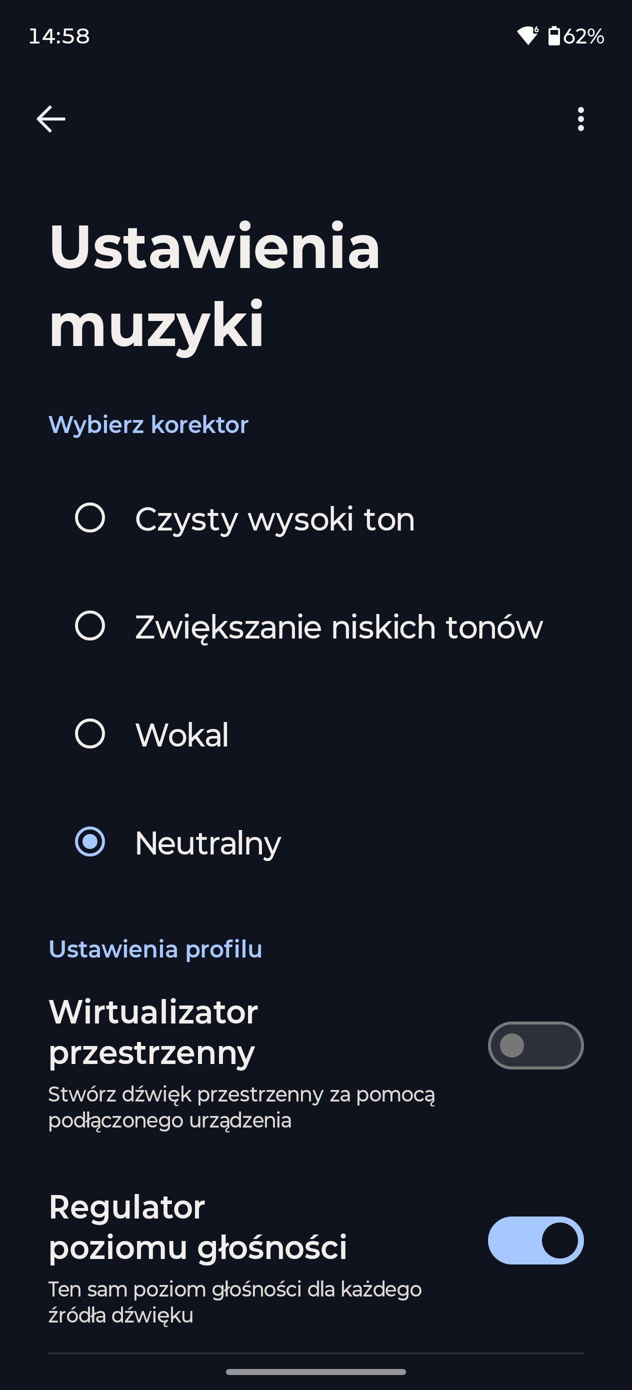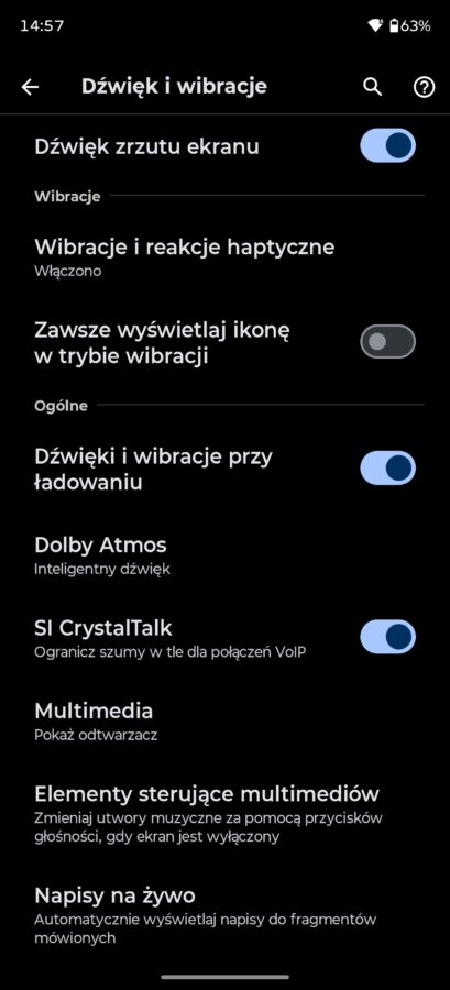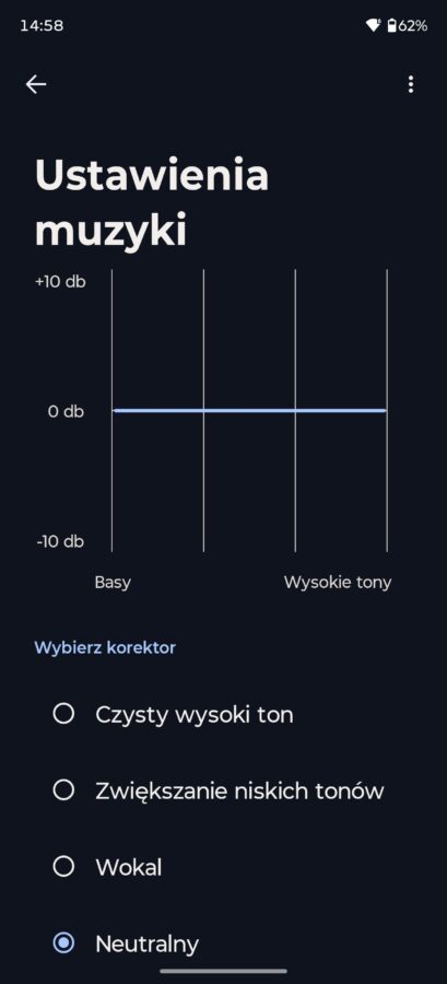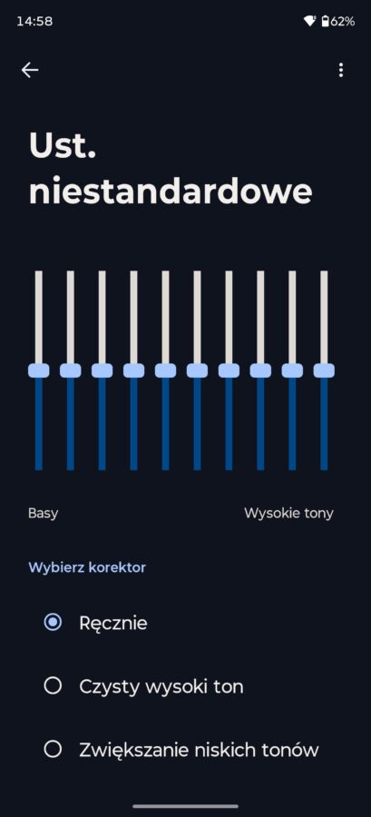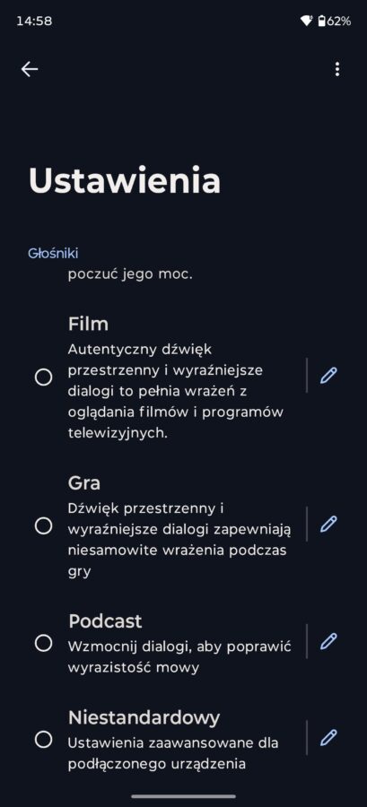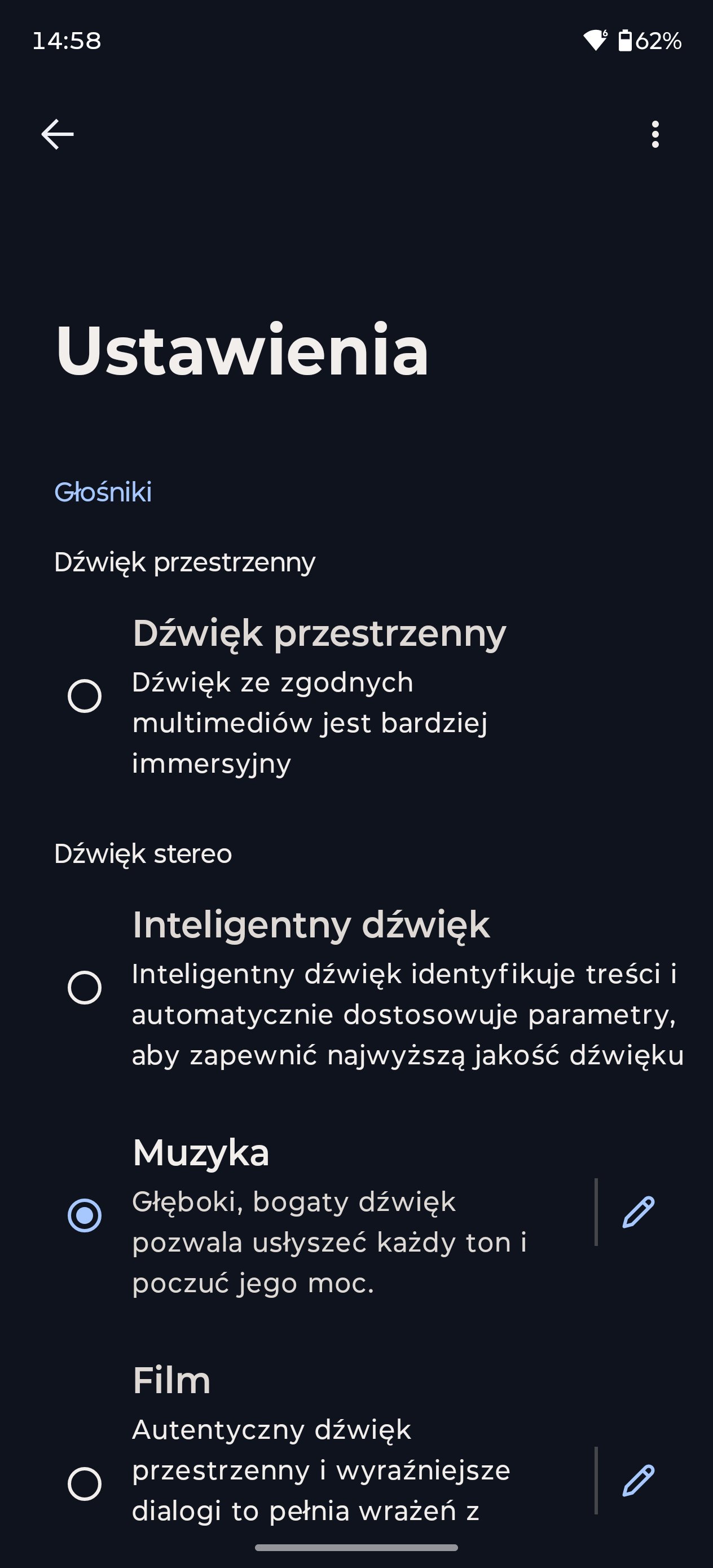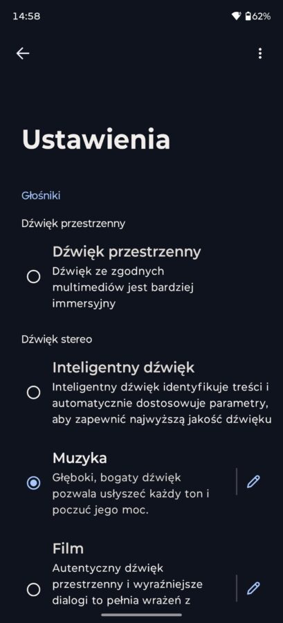 Nie zabrakło także wsparcia dla dźwięku Dolby Atmos, a ustawienia audio obejmują kilka gotowych presetów brzmienia, takich jak dźwięk przestrzenny, inteligentny, muzyka, film, gra i podcast. Praktycznie każde z nich możemy dodatkowo spersonalizować lub stworzyć całkowicie niestandardowy. Opcji jest tutaj naprawdę dużo, co nie zdarza się w wielu smartfonach.