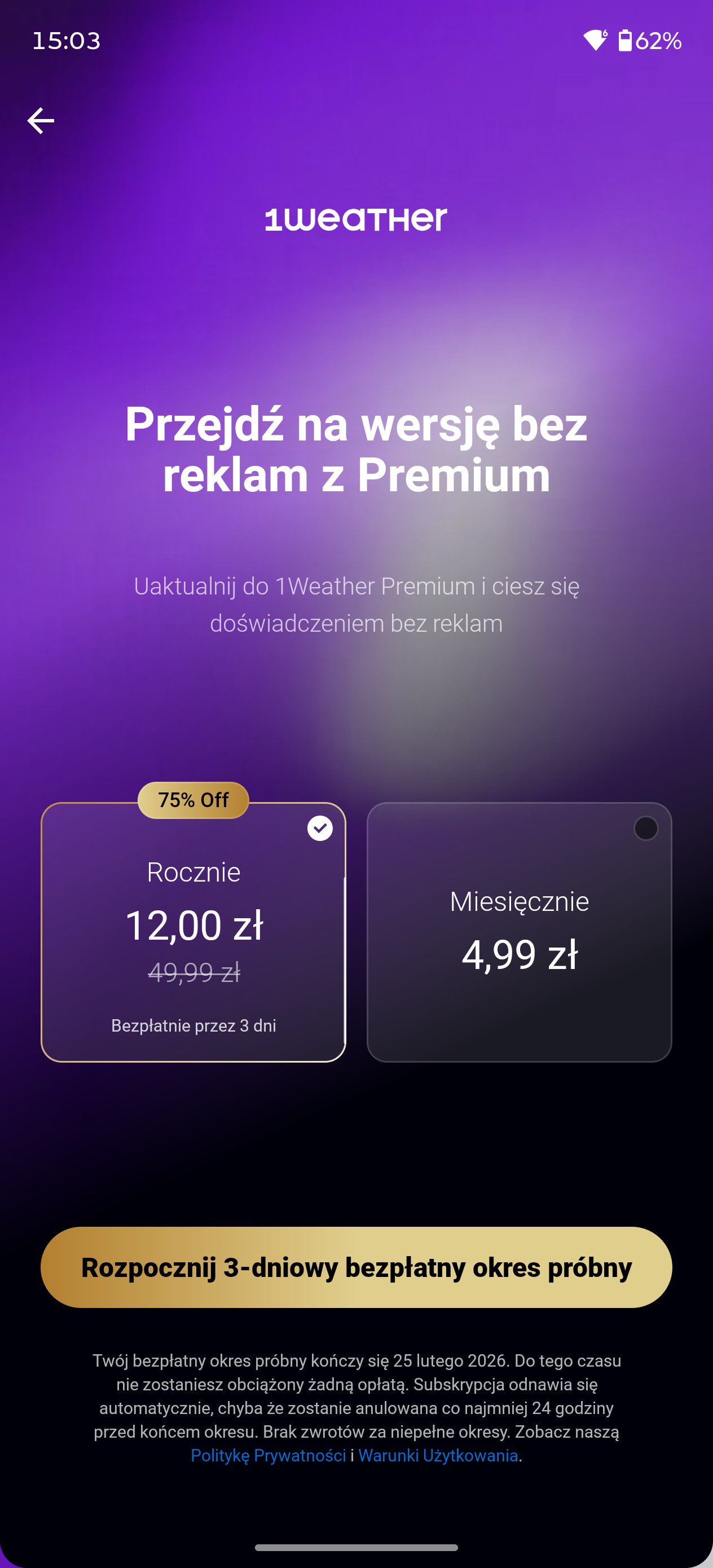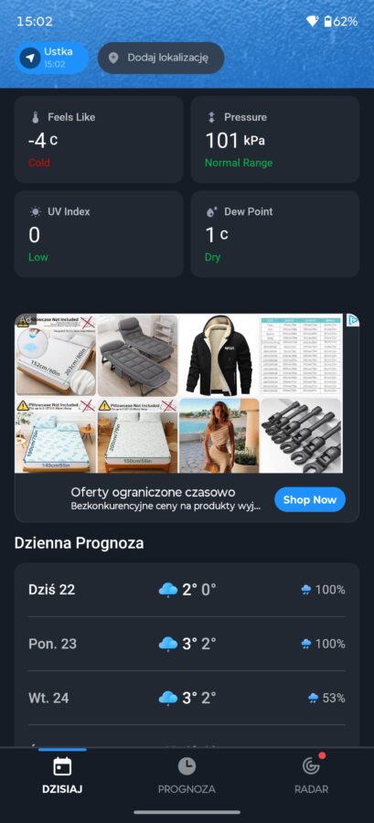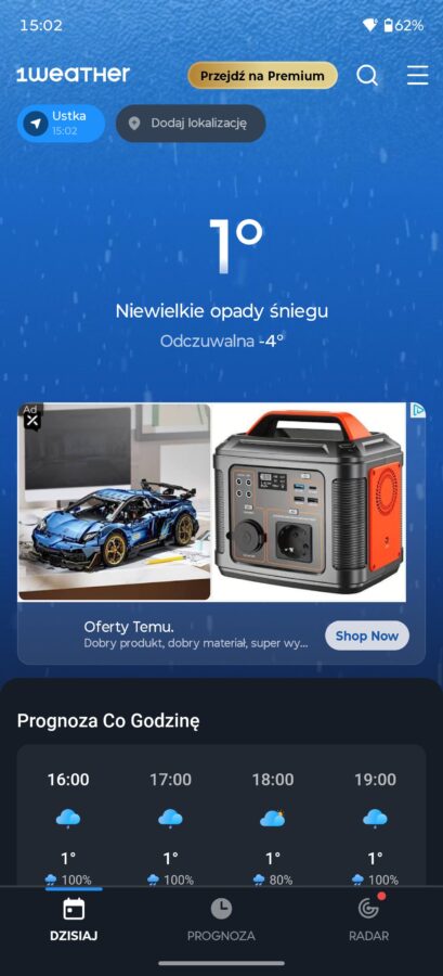 Po drugie, domyślnie wgrana przez Motorolę aplikacja pogody – nazwana 1Weather – wyświetla w interfejsie reklamy. I to nie jedną, bo przewijając w dół szczegóły prognozy widzimy ich aż cztery. Reklam możemy się pozbyć… wykupując wersję premium. Brzmi to co najmniej groteskowo. Na szczęście, w pozostałych miejscach oprogramowania nie uświadczymy już takich fikołków, ale – w moim odczuciu – jest to mocno niezrozumiałe podejście.