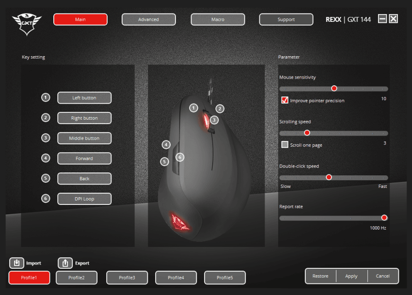 Po pobraniu sterownika z sieci dostajemy dostęp do sporej gamy możliwości konfiguracji myszki. Samo oprogramowanie nie należy do szczególnie urodziwych, ale funkcjonalności nie mogę mu odmówić. Z pomocą programu możemy ustawić kilka stopni DPI, którymi możemy sterować za pomocą przycisku na myszy, ustawić własne macra, pozmieniać funkcje przycisków na myszy, jak i możemy całkiem dowolnie sterować oświetleniem LED. Do tego dochodzi możliwość zapisania naszych ustawień na 5 różnych profilach. Oprogramowanie więc jest całkiem funkcjonalne i nie mogę się do niego jakoś szczególnie przyczepić.