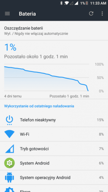 Czas działania na włączonym ekranie przy moim trybie użytkowania był przeróżny. Najczęściej korzystałam z OnePlus 3T z jasnością ekranu ustawioną na maksa, z włączoną transmisją danych i GPS-em. Przy takiej eksploatacji telefon wołał o podłączenie do ładowarki po niecałych trzech godzinach. Gdy jednak jasność ekranu zmniejszyłam, GPS wyłączyłam, a dane komórkowe przeplatałam z połączeniem WiFi, czas na włączonym ekranie (SoT) wynosił do 5,5 godziny. I to już można określić jako dobry czas.