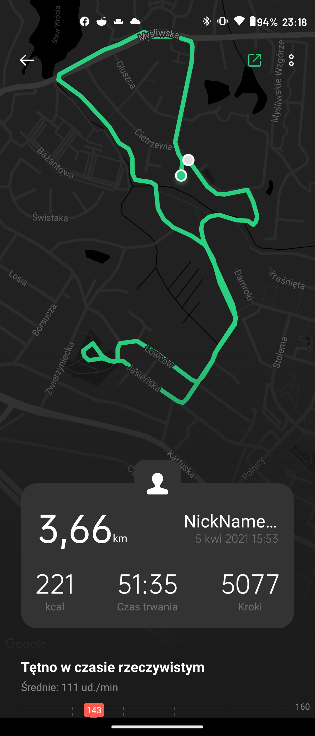 Zacznijmy od treningu. Jeśli chodzi o przemierzony dystans czy średnią prędkość, tutaj jesteśmy mocno zależni od GPS-u, a tego Oppo Band – jak już powiedziałem wcześniej – nie oferuj. Z kronikarskiego obowiązku jednak nadmienię, że porównując pomiar dystansu Oppo Watcha, który ten GPS wbudowany ma, z Oppo Bandem, różnice w dystansach były minimalne i na dystansie 5 km było to z reguły +- 50-70 metrów.