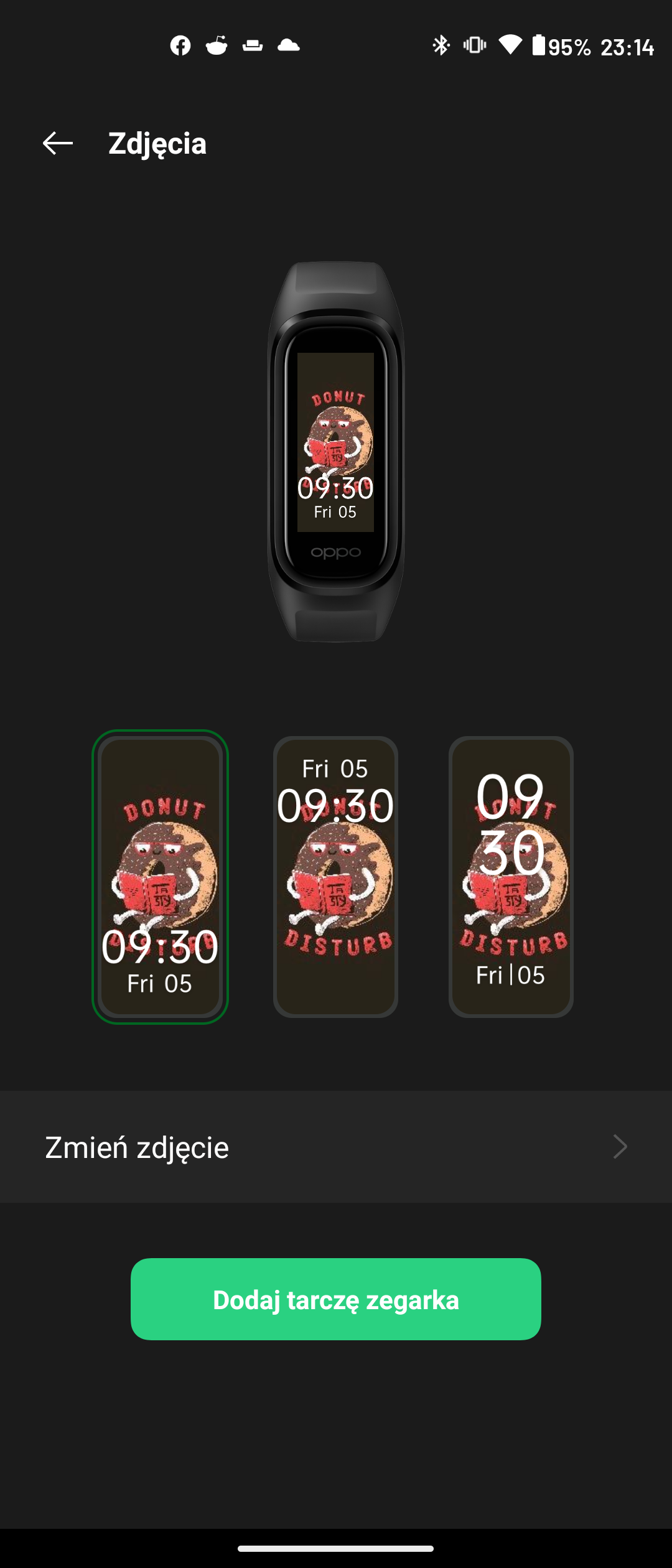 W pamięci opaski może znajdować się jednocześnie 5 tarcz, które możemy dowolnie zmienić albo z poziomu aplikacji, albo bezpośrednio na opasce, przesuwając placem w lewo lub w prawo. Co ważne, może to być 5 tarcz z naszymi zdjęciami, a więc Oppo pozostawia pełną dowolność w tej kwestii.