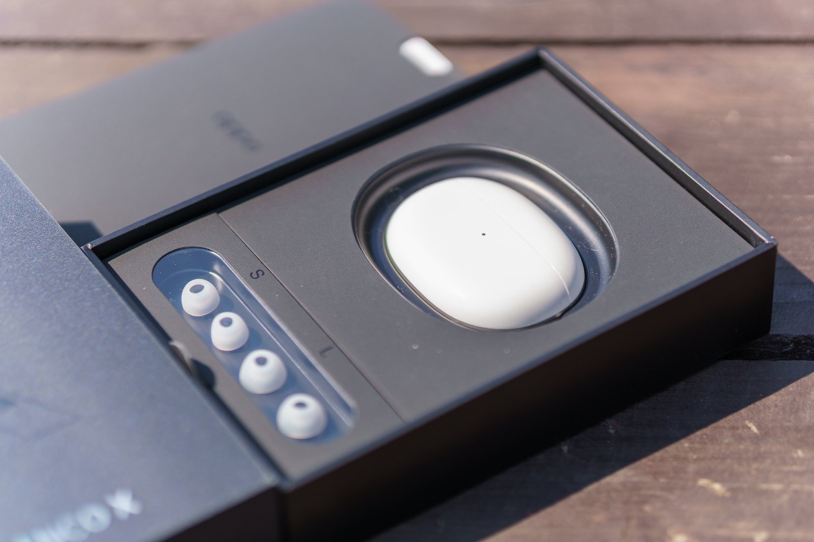 Całość zestawu Oppo Enco X dociera do użytkownika w gustownym i stylowym, czarnym opakowaniu. W środku znalazłem etui oraz komplet silikonowych nakładek, mających pozwolić dopasować słuchawki do kanału słuchowego – w moim przypadku wymagana była zmiana na rozmiar L. Etui zawiera oczywiście wbudowany akumulator, służący do doładowywania słuchawek, cewkę służącą do bezprzewodowego ładowania całości, gniazdo USB-C dla zwolenników kabelków oraz – rzecz jasna – słuchawki w środku.