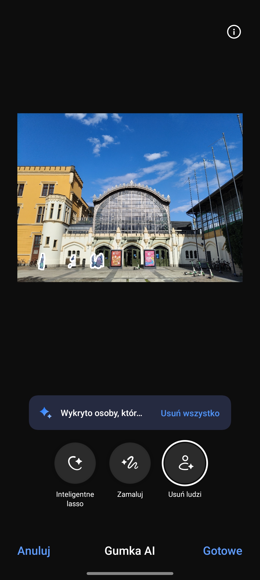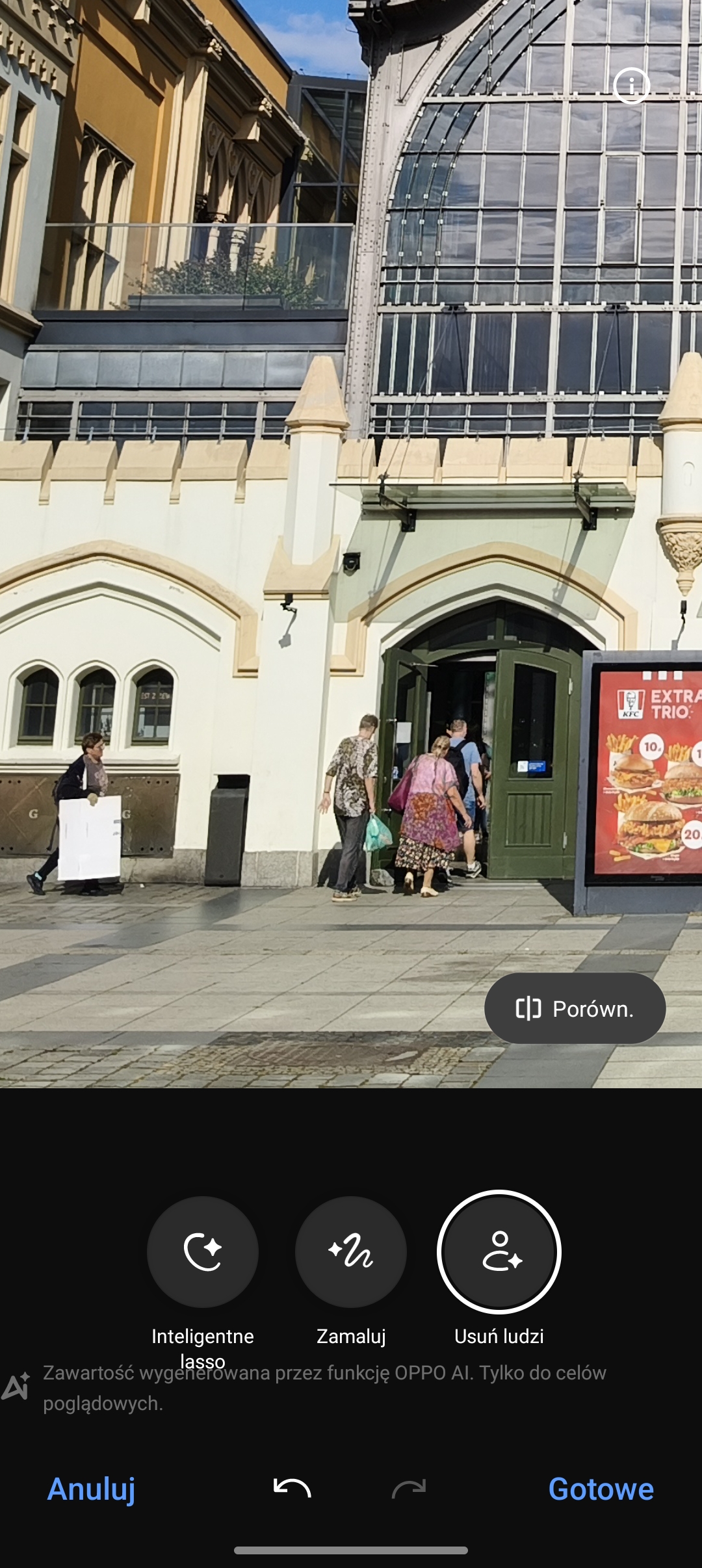Przyznam, że dając Reno 12 Pro ostatnie, najtrudniejsze zadania, byłem niemal pewien, że urządzenie sobie nie poradzi. Dużo osób czy obiekty zasłaniające ważne dla całości szczegóły miały stanowić ostateczny test. Sztuczna inteligencja tym razem częściowo poradziła sobie z wózkiem dziecięcym. Niestety, ignoruje ona osoby na pierwszym planie, zostawia cienia na podłożu, a analiza w przypadku lasso raz pracuje zbyt szeroko i psuje jeden fragment, innym razem nie bierze pod uwagę całego zdjęcia i – zamiast przewidzieć powtarzający się wzór – tworzy artefakty zdradzające, że coś jest nie tak.