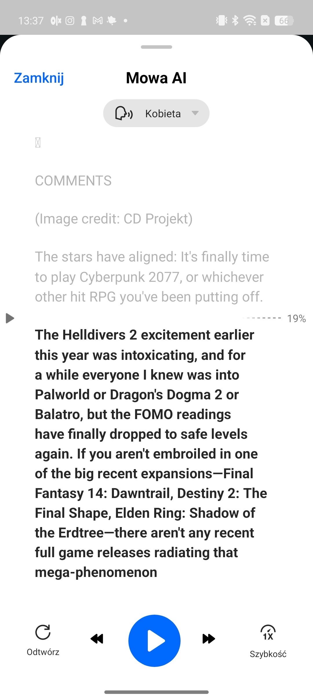 Najbardziej zawiodłem się na „Mowa AI”. Uruchamiając newsa w przeglądarce i włączając funkcję spodziewałem się usłyszeć od razu właściwy tekst. Zamiast tego AI zabrało się za czytanie kategorii wymienionych w pasku nawigacyjnym, a właściwa treść pojawia się dalej.