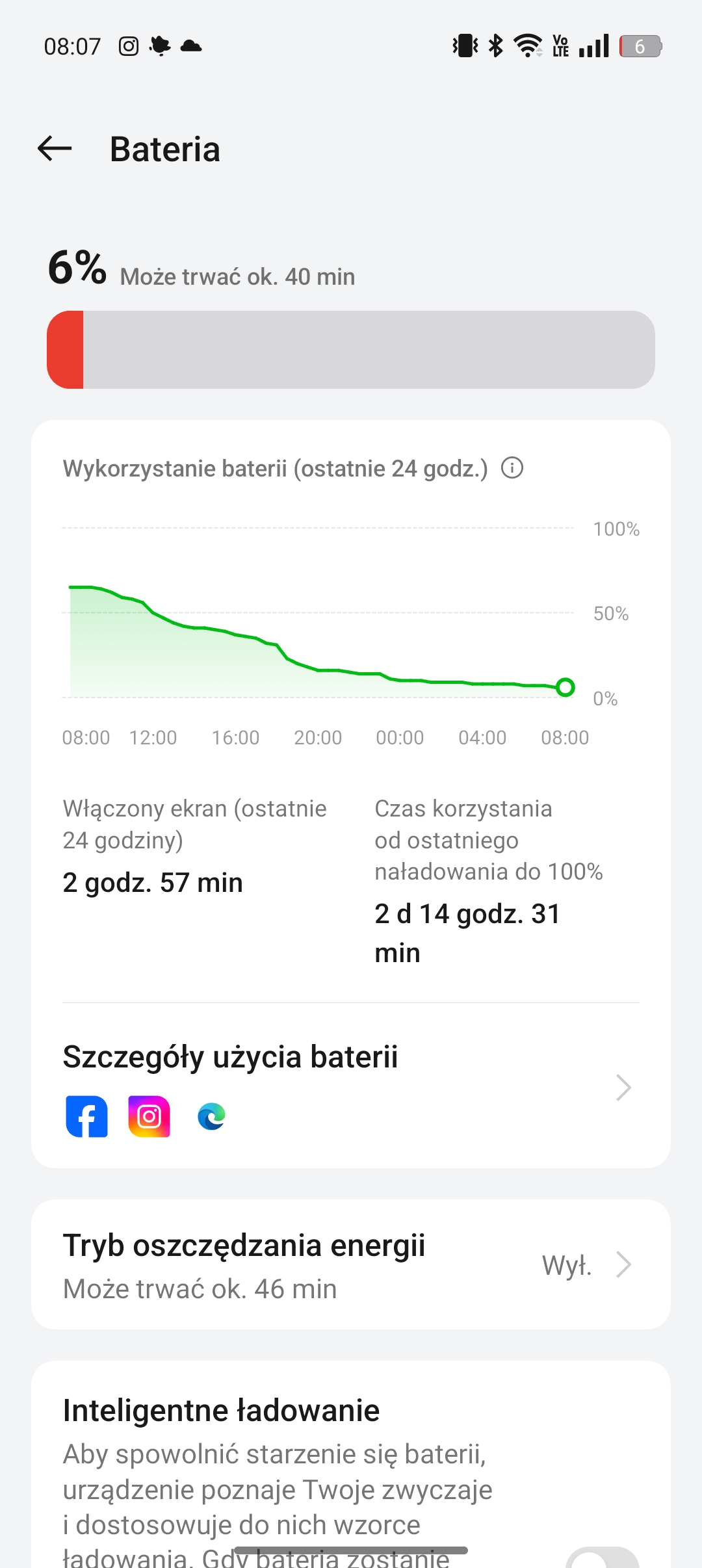 Dwutygodniowe obserwacje, jak zachowuje się urządzenie potwierdziły, że krzywa zjeżdżającego stanu baterii zachowywała się w miarę standardowo i przewidywalnie. Niestety, nie mogę tym razem pochwalić się dokładnymi wynikami SoT, gdyż smartfon informuje o czasie włączonego ekranu z ostatnich 24 godzin.