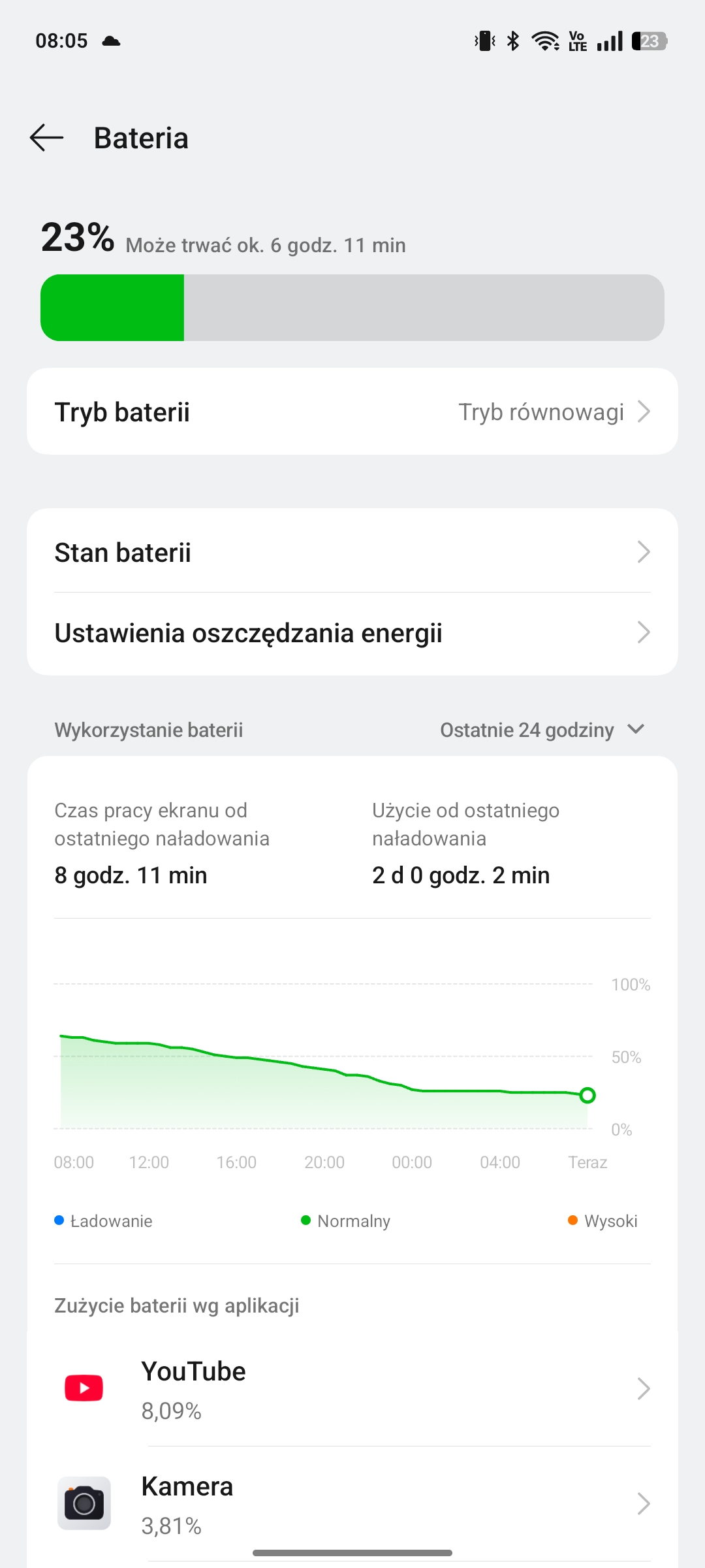 Najbardziej reprezentatywny jest cykl mieszany (z łącznością komórkową i Wi-Fi). Przeprowadziłem kilka testów i udało się w ten sposób uzyskać uśrednione wyniki. Za każdym razem po dwóch okrągłych dobach i SoC powyżej 8 godzin akumulator wciąż miał przeszło 20%, więc śmiało można stwierdzić, że konieczność codziennego ładowania będą mieli tylko użytkownicy, którzy naprawdę intensywnie korzystają z telefonu – grając przez wiele godzin w wymagające tytuły.