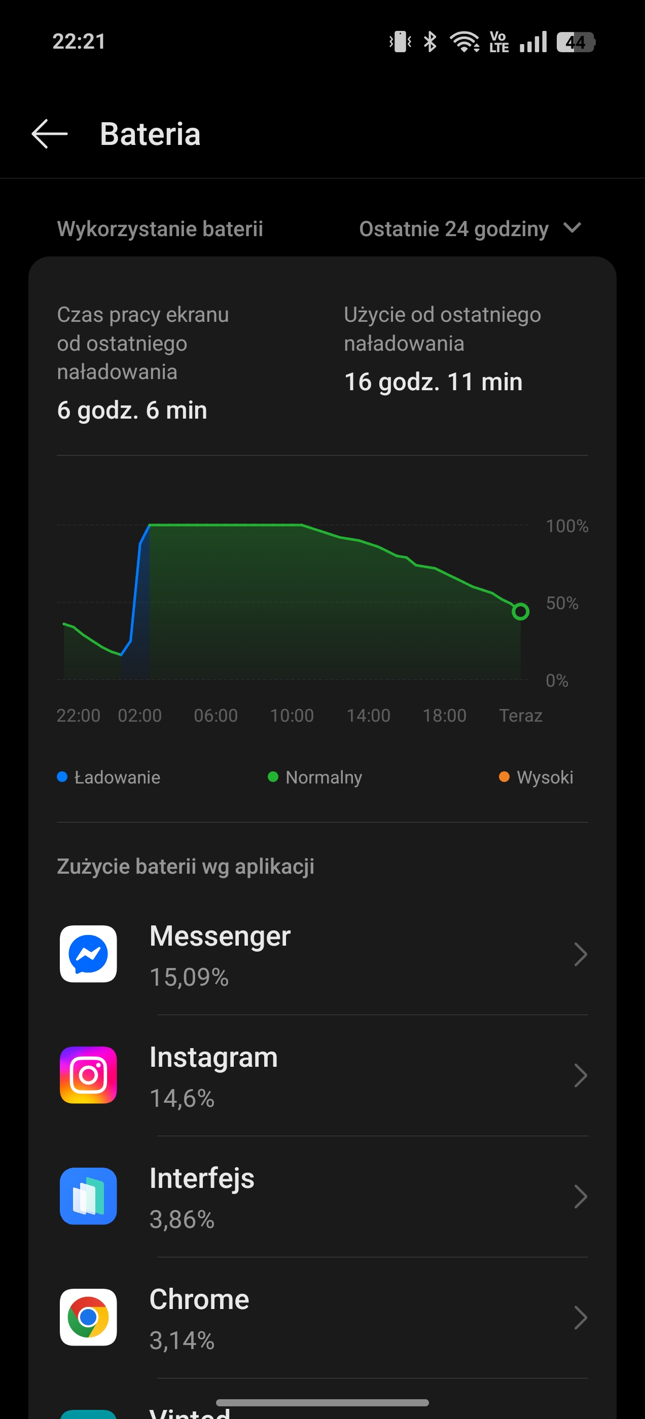 Nie mógłbym nie wspomnieć też o wynikach Screen on Time, czyli czasie na włączonym ekranie. Przy przeważającym użyciu WiFi, w pełnym cyklu Oppo Reno 13 Pro potrafił dobić do 8-9 h SoT, a jeden wynik przebił nawet granicę 10 h. Najczęściej, na koniec dnia, czyli wtedy, gdy z reguły zostawało mi jeszcze wspomniane 30-40% baterii, SoT wynosił 5-6 h.