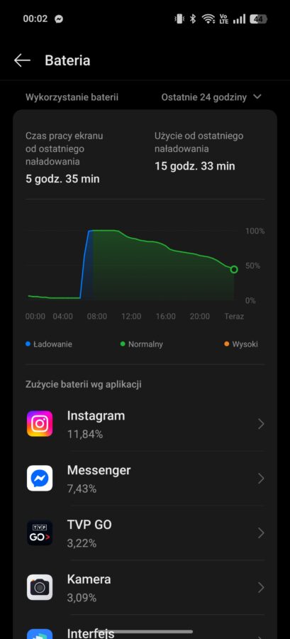 Cały dzień od rana do bardzo późnego wieczora to absolutne minimum, jakie byłem w stanie z reguły uzyskać. W bardziej intensywny dzień, gdzie więcej było użycia 5G, telefon domagał się ładowania około 22, co i tak uważam za bardzo dobry wynik. Często, w średnio intensywne dni, na koniec dnia potrafił mieć jeszcze 30-40% zapasu energii na kolejny dzień, przez co trzykrotnie udało mi się pracować na nim przez sporo ponad dobę.