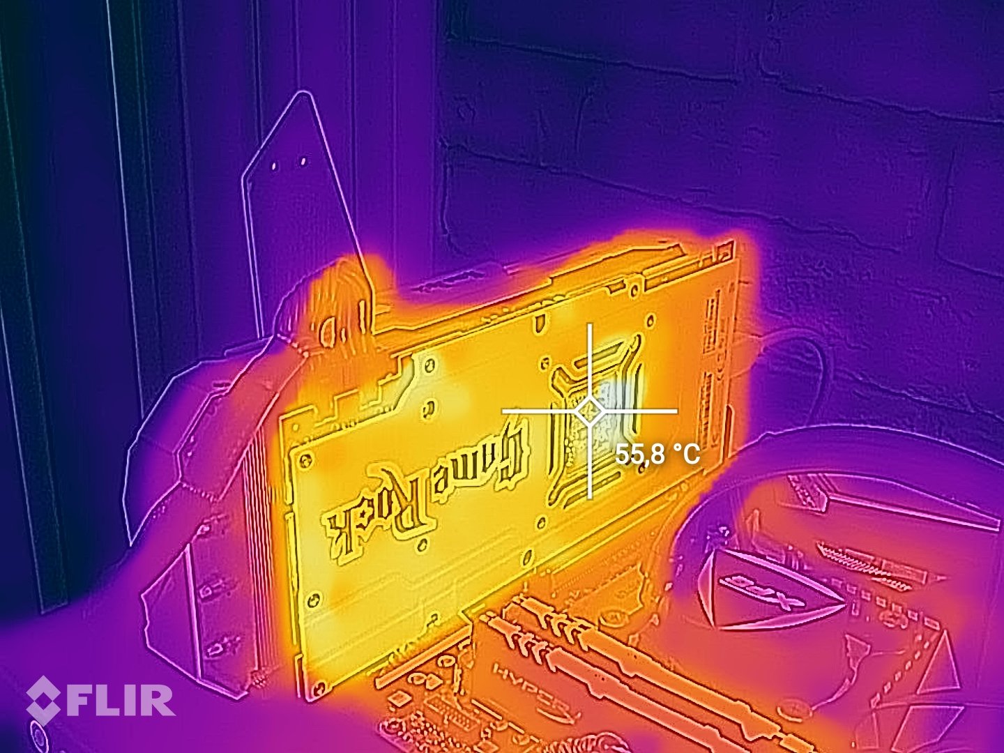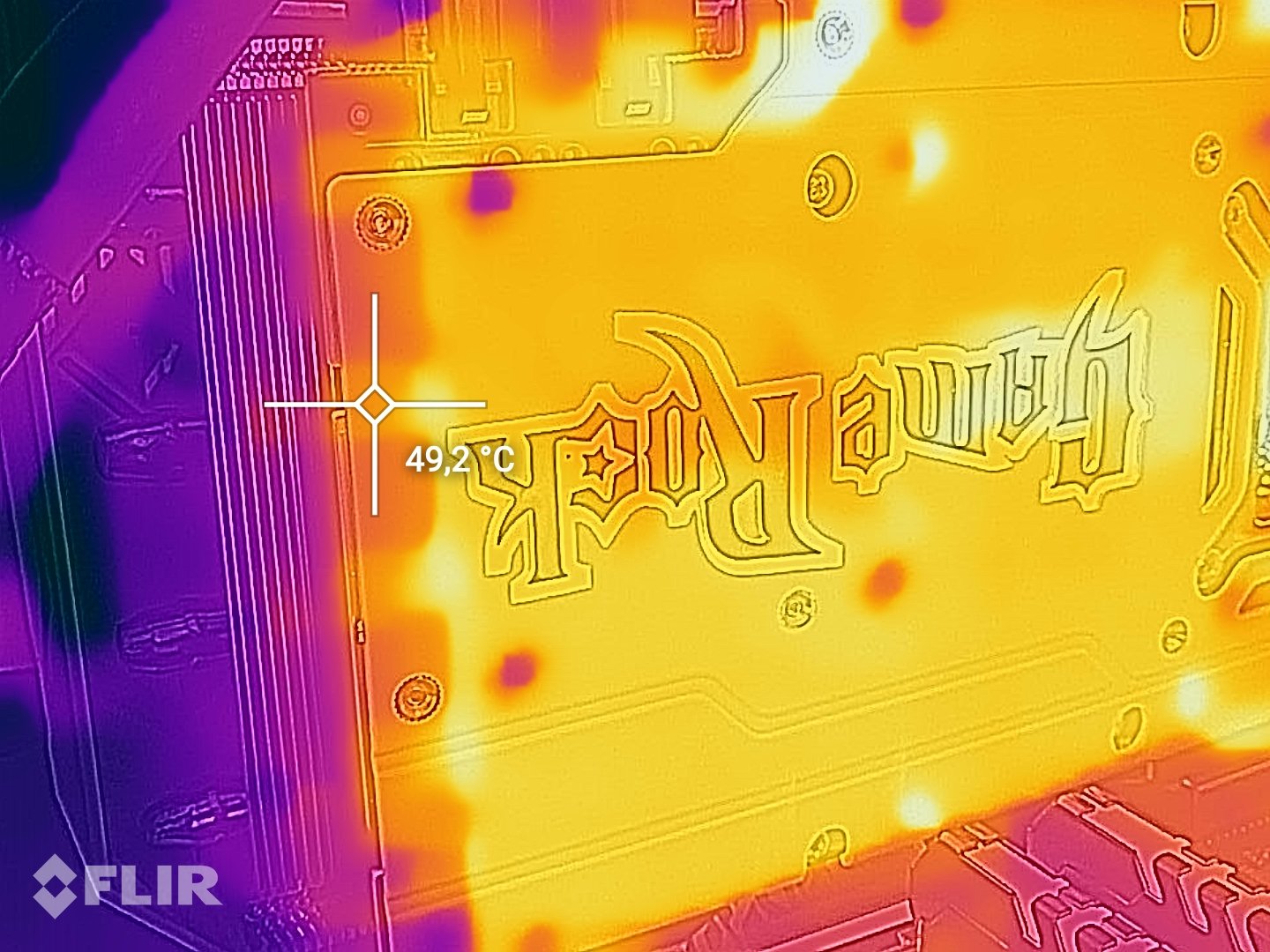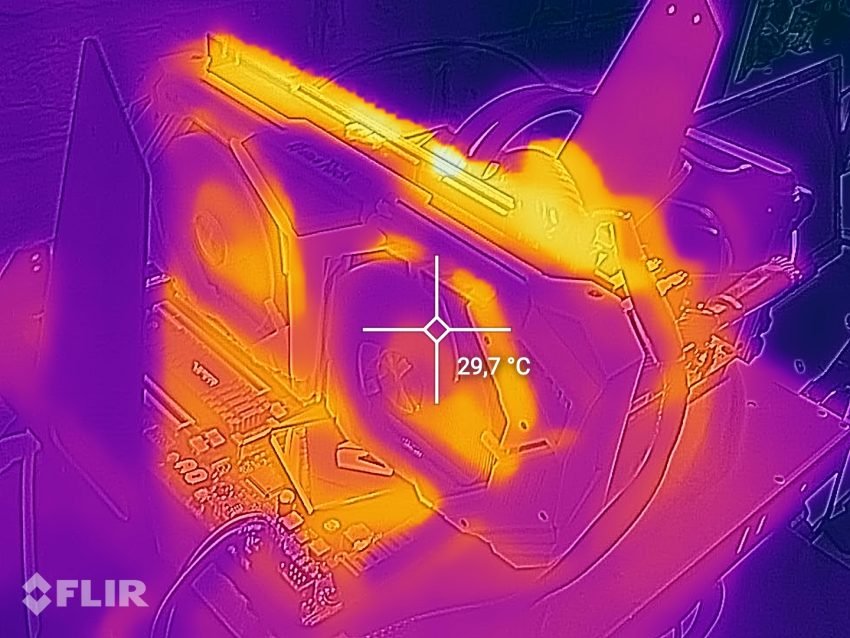 Ogromny plus dla producenta za zastosowanie metalowego PCB karty – oprócz tego, że oczywiście cała skąpana jest w bieli, to skutecznie pomaga odprowadzać ciepło z karty graficznej. Najlepszym dowodem będą zdjęcia termiczne wykonane podczas pełnego obciążenia karty.