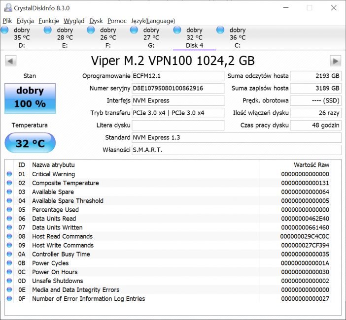 VPN100 ma dość typowy dla dysków tej klasy MTBF rzędu 2 mln godzin (228 lat), co jak zwykle należy interpretować tak, że na każde 288 wyprodukowanych dysków, przeciętnie jeden ulegnie awarii w ciągu roku, przy założeniu, że pracować będzie przez okrągłą dobę. Drugim parametrem określającym niezawodność jest TBW, czyli ilość danych, jaką producent gwarantuje, że można zapisać na dysku. Wartość ta dla modelu o pojemności 1 TB, jaki otrzymałem do testów, ustalona jest na bardzo wysokim poziomie 1665 TB – jest to na poziomie najlepszych dysków na rynku (i niemal trzykrotnie więcej niż dla 970 EVO Plus o tej samej pojemności) – pozostaje więc mi się zdziwić, że Patriot daje na swój dysk jedynie trzyletnią gwarancję.