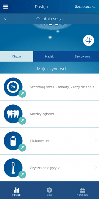 Główny ekran aplikacji Sonicare, której zostanie poświęcona lwia część tej recenzji, składa się z kilku segmentów. Pierwszy z nich służy do nawigowania i umożliwia wybór menu hamburgerowego oraz przejście do samego trybu mycia zębów. Poniżej znajduje się pasek, na którym możemy wybrać podsumowany niżej okres. Wybrać można pomiędzy jednym, 7, 30, 60, 90 i 180 dniami. Jeszcze dalej widoczny jest pasek Porady, w obrębie którego aplikacja zasypuje nas ciekawostkami na temat mycia zębów. Aż wreszcie najbardziej interesująca nas część – Efekty szczotkowania, gdzie znajduje się model naszych zębów, na którym możemy podglądać skuteczność naszego szorowania. Część tę możemy podzielić na Obszar, Nacisk i Szorowanie, a odpowiednie kolory – żółty, fioletowy i czerwony (a raczej ich brak) poinformują nas, czy wszystko robimy dobrze. Jeszcze niżej znajduje się karta Moje czynności, w której możemy podejrzeć kalendarze uwzględniające różne elementy dbałości o higienę jamy ustnej – szczotkowanie zębów przez dwie minuty dwa razy dziennie, używanie nici dentystycznej, płukanie ust, a także czyszczenie języka. O tyle, o ile pierwsza część uzupełniana jest samoistnie przez szczoteczkę i nie możemy ingerować w nią ręcznie, tak pozostałe czynności można „odhaczać” samodzielnie, a przy okazji każdego mycia zębów szczoteczka zapyta nas o poszczególne składowe.