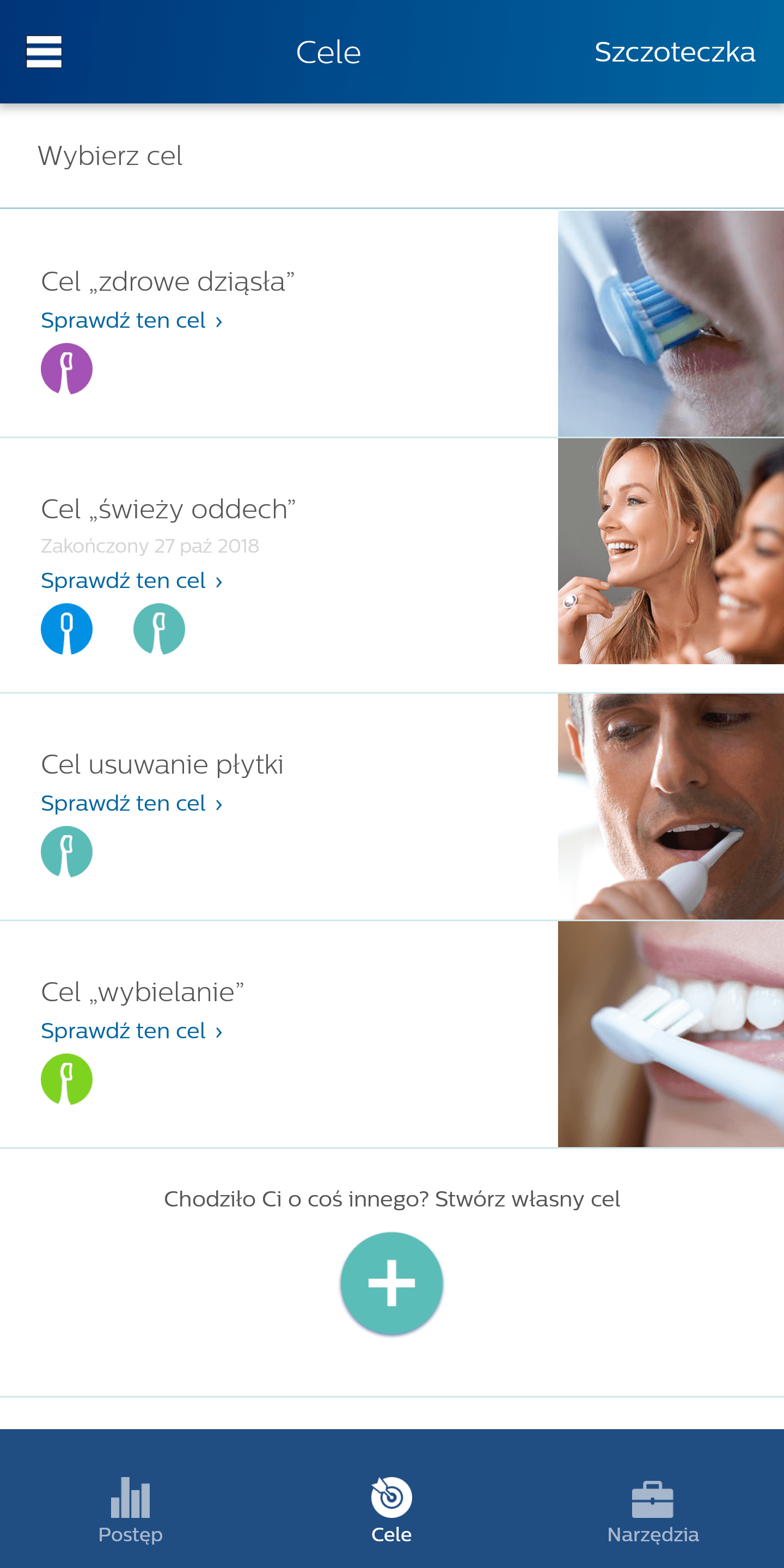 Myślicie, że to wszystko? To była dopiero karta Postęp. W zakładce cele można wybrać… cel, do którego dążymy – szczoteczka będzie dbała tam o to, żebyśmy pamiętali o higienie naszej jamy ustnej. Jestem niemal przekonany, że to flagowa część tej aplikacji, ale w moim przypadku się nie sprawdziła. Odpuściłem sobie cele, takie jak wybielanie czy usuwanie płytki i postawiłem na „świeży oddech” – ot, żebym codziennie dwa razy mył zęby, w końcu to nic zaskakującego. No nie do końca… Po pierwsze, aplikacja dwukrotnie odrzuciła moje cele z nieokreślonych przyczyn, po drugie – kalendarz szczotkowania uzupełniany jest na podstawie godzin. Oznacza to, że przy każdorazowym myciu zębów w godzinach nocnych, aplikacja zaliczała mi szczotkowanie do porannej sesji dnia następnego i uznawała, że przegapiłem wieczorne mycie. Nie pozostawało mi zatem nic innego, jak przestawianie godziny przed szczotkowaniem po północy – szkoda przecież mieć pustą lukę w segmencie szorowanie, kiedy te zęby się myło, prawda?