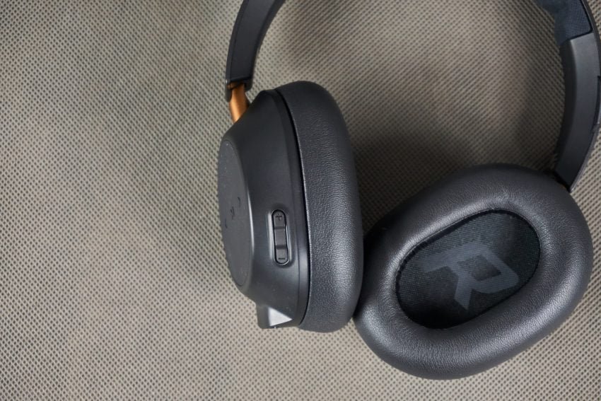 Lewa muszla jest nieco bogatsza w elementy sterowania – w miejscu, gdzie po prawej stronie znajduje się włącznik, są też dwa połączone ze sobą przyciski służące do regulacji głośności. One także otrzymały drugą funkcję – dłuższe wciśnięcie + i – jednocześnie powoduje włączenie lub wyłączenie ANC. O tyle, o ile wyłączeniu towarzyszy komunikat głosowy, tak włączenie zasygnalizowane zostanie piknięciem oraz… odczuwalną redukcją szumów ;). Warto nadmienić, że z tego poziomu nie możemy regulować stopnia Active Noise Cancellingu – w tym celu musimy zwrócić się o pomoc do aplikacji, o której kilka słów powiem za chwilę. Teraz jeszcze dwa słowa o tym, że na lewej muszli, która została pokryta gumą (swoją drogą, łatwo łapiącą kurz), znajdują się trzy przyciski, których funkcji chyba nawet nie muszę tłumaczyć. Dla odmiany, prawa część słuchawek jest w tym miejscu wykończona tym samym plastikiem, co reszta konstrukcji i w tym miejscu dodatkowo pojawia się niewielkie wytłoczone PLT.