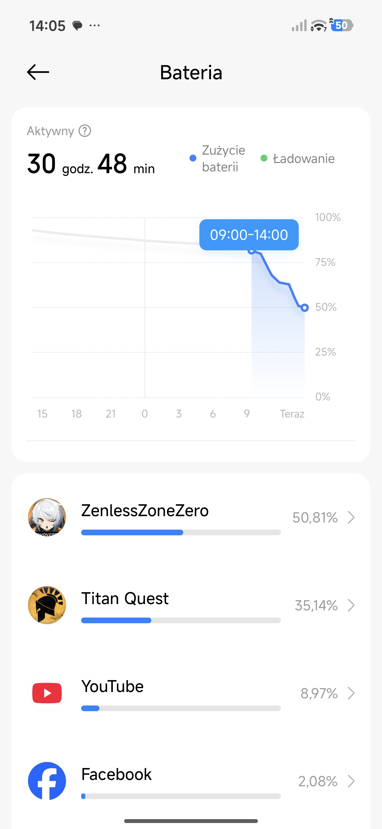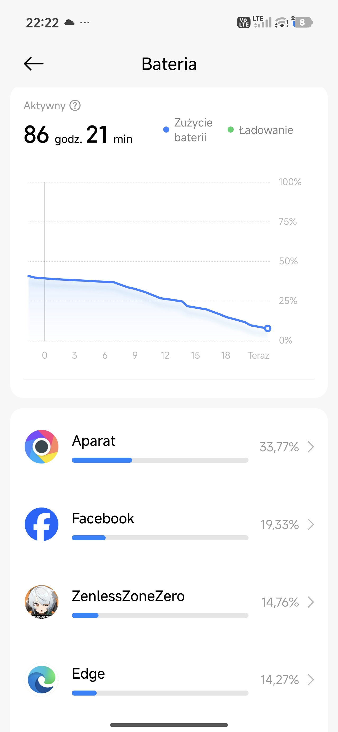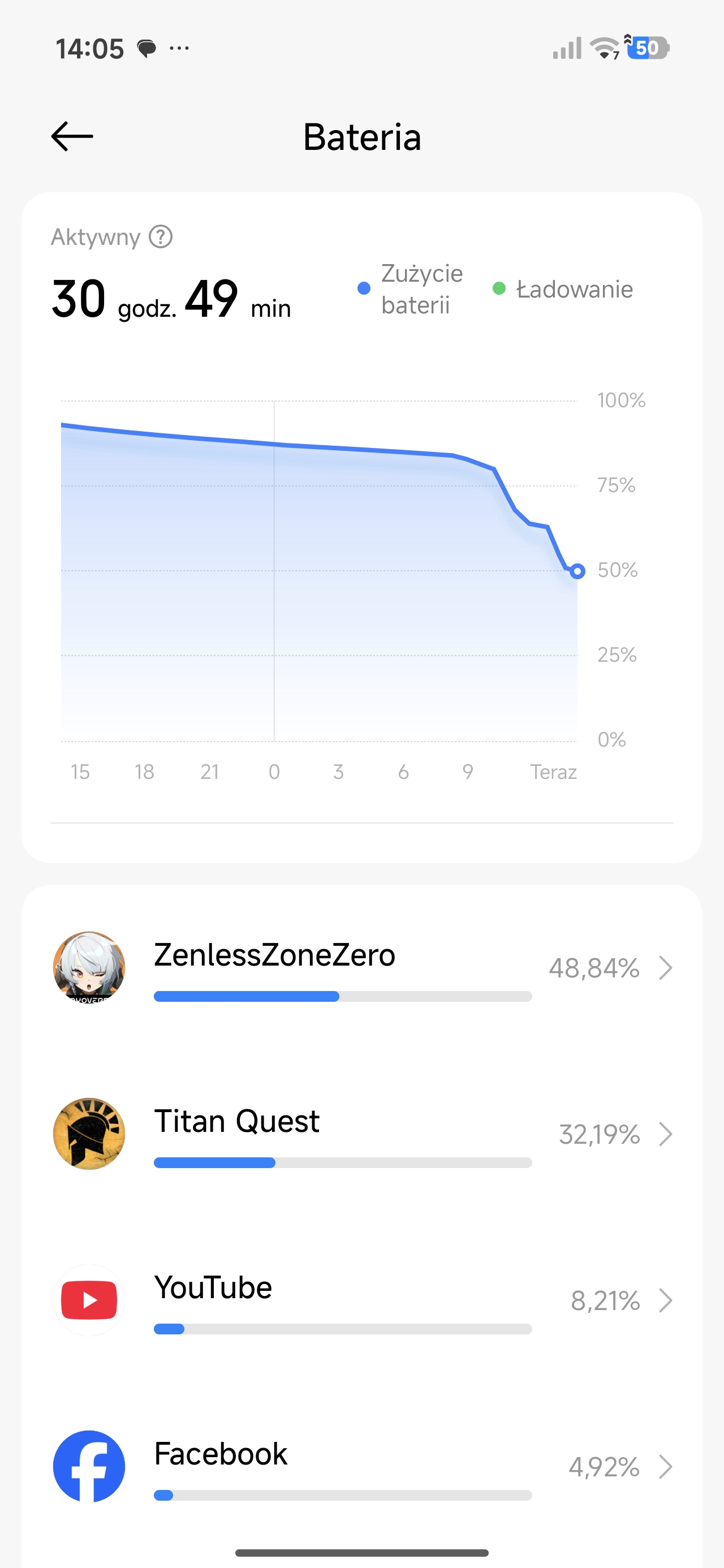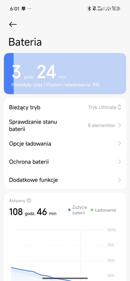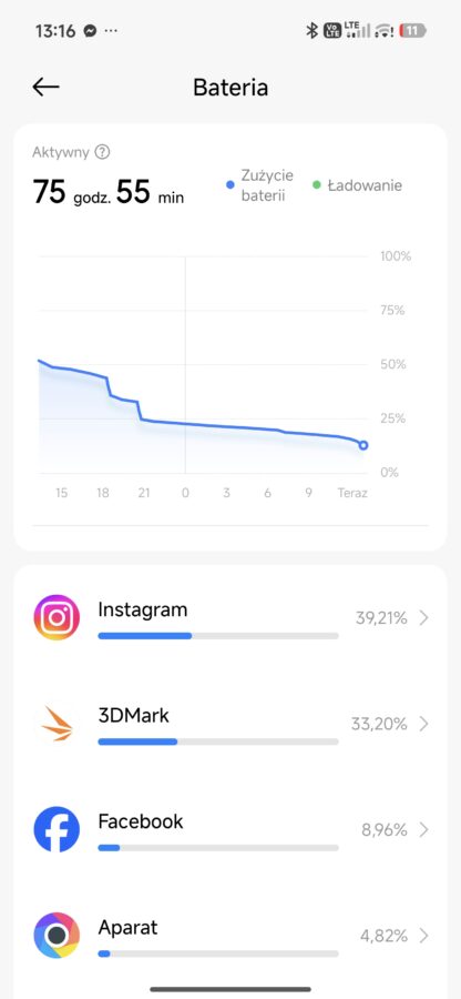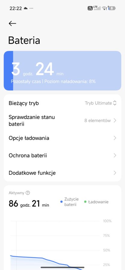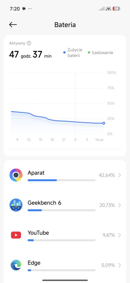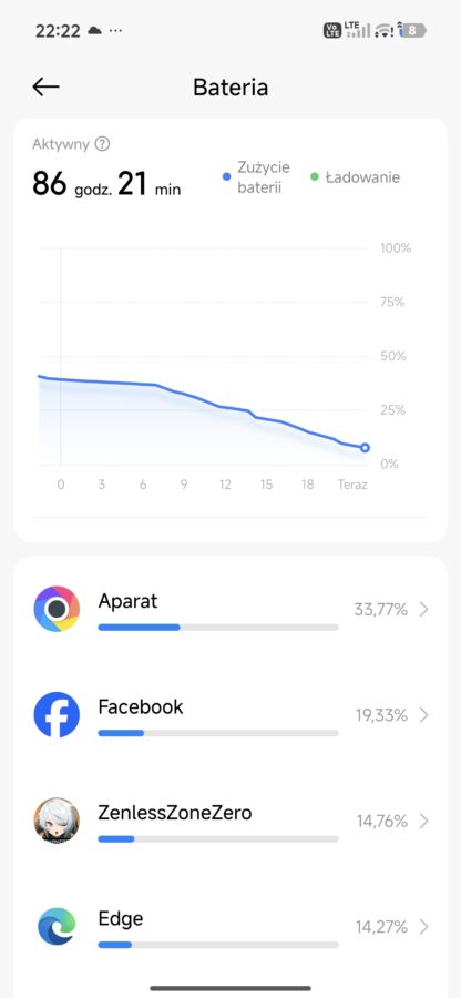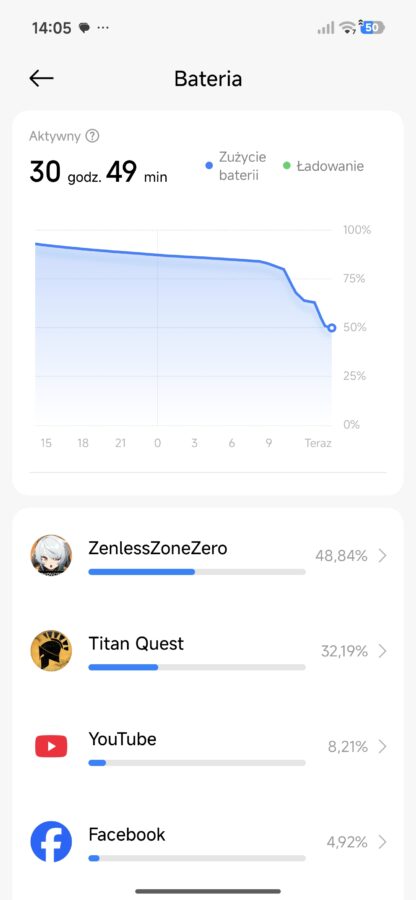 Inny scenariusz: bateria nieco zjedzona poprzedniego dnia. Odpalam na dwie godziny wymagające w kwestii grafiki gry. Po tym czasie telefon pokazuje spadek o około 25-30% baterii. Matematycznie oznaczałoby to, że 6 godzin nieprzerwanego grania w Zenless Zone Zero jest absolutnie możliwe z Poco X8 Pro Max.