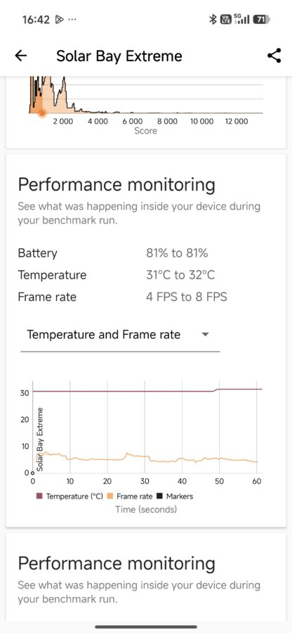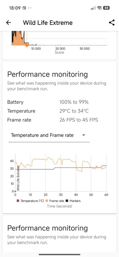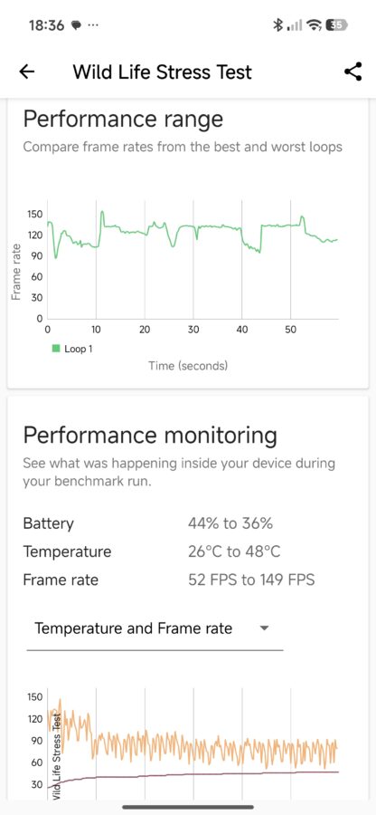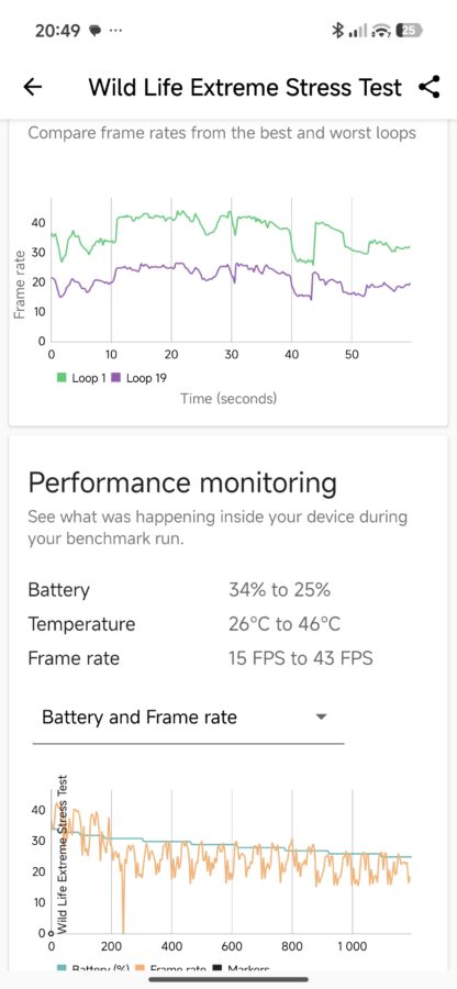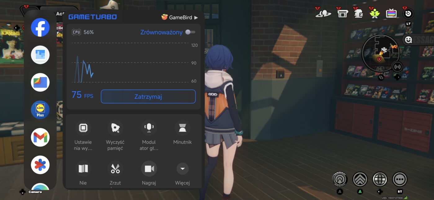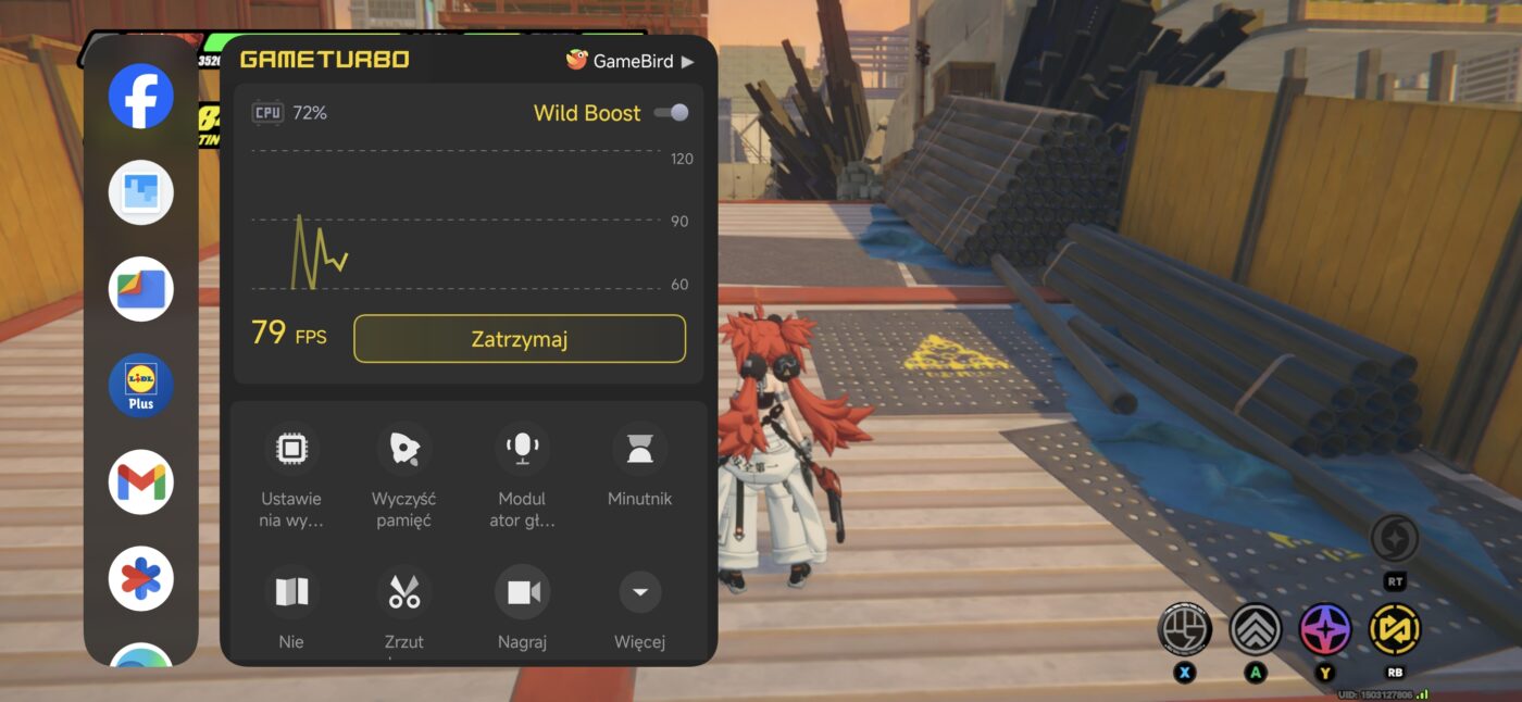 Tak duża moc ma ciekawe przełożenie na gaming. Biorąc na tapet Zenless Zone Zero (maksymalne ustawienia i 60 klatek na sekundę) i Titan Quest (również najwyższe ustawienia, z docelowym 120 fps-ami) godzinna sesja nie robi na urządzeniu wrażenia – zużycie procesora sięgało 50-60%, a telefon nagrzewał się maksymalnie do 38 stopni. Szkoda tylko, że dedykowana nakładka dla graczy nie jest przesadnie rozbudowana – mamy jedynie podgląd CPU+klatkarz, czyszczenie pamięci, modulator głosu, kombo nagrywanie + screenshoty oraz minutnik.