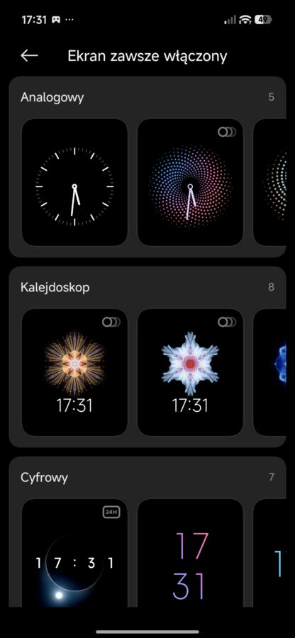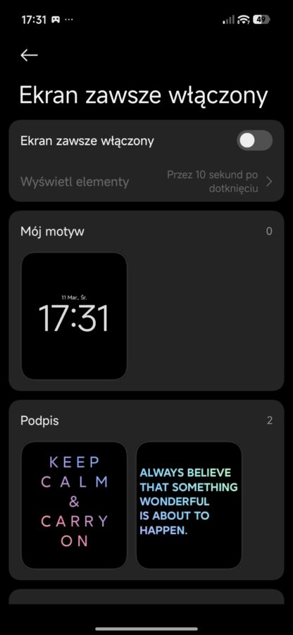 Uruchamiając zawsze włączony ekran możliwe są niestety tylko dwie opcje: wyświetlająca treści 10 sekund po wyłączeniu ekranu oraz inteligentna, sprawdzająca czy akurat ktoś nie patrzy na ekran. Drugi wariant potrzebuje patrzenia się w stronę wyświetlacza przez ok. sekundę aby zadziałać – jest więc dobrym kompromisem między intuicyjnym działaniem a oszczędnością baterii.