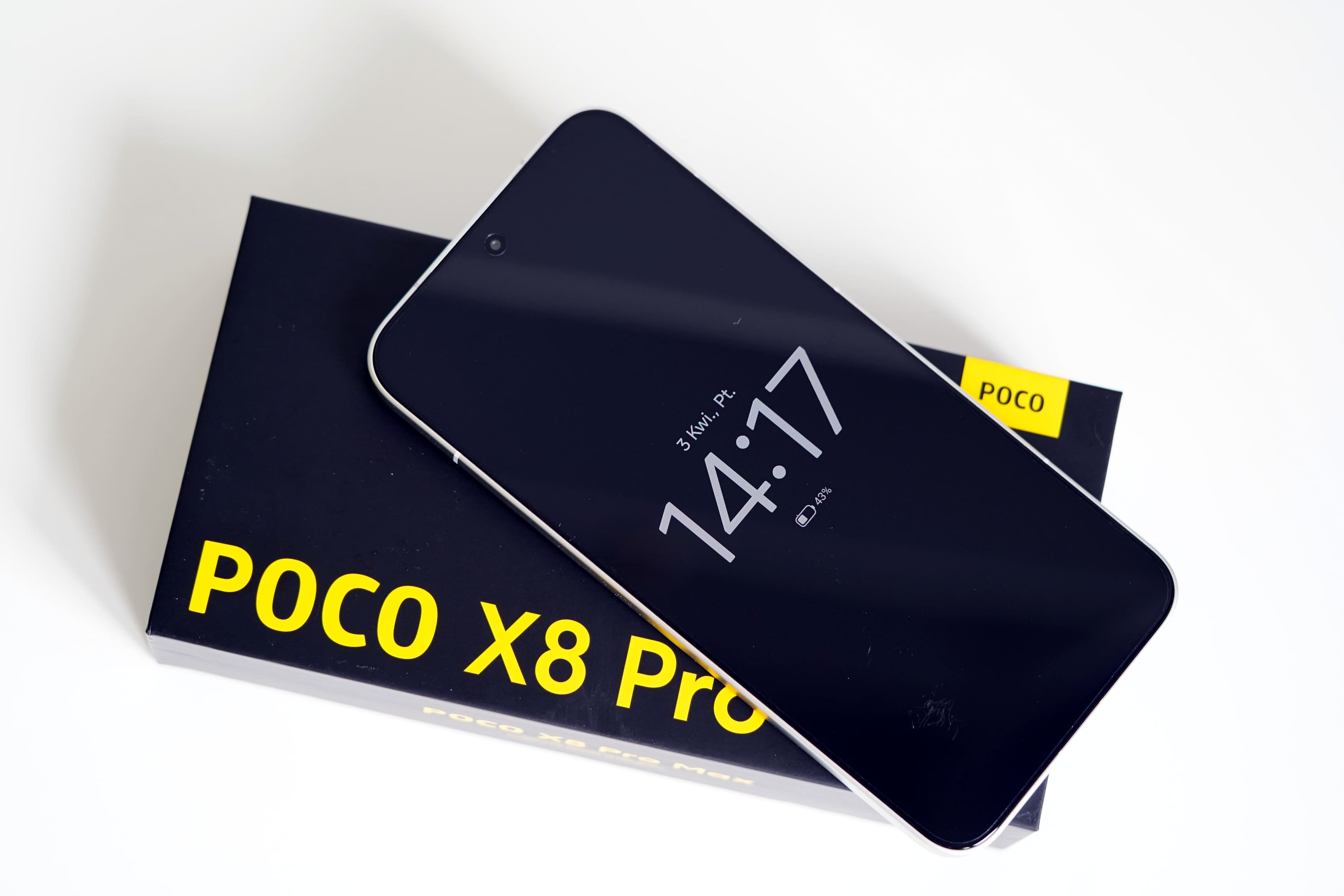 Obecny stan gry w Poco jest mi znany, więc wiedziałem, czego się spodziewać po czarnym pudełku z żółtymi akcentami. Po szybkim rozpakowaniu zaczynam oględziny od smartfona. Ten przyjechał do mnie w kolorze białym i z fabrycznie nałożoną folią ochronną, więc z automatu miał u mnie bonusowe punkty za styl i oszczędzanie czasu potencjalnym kupującym.