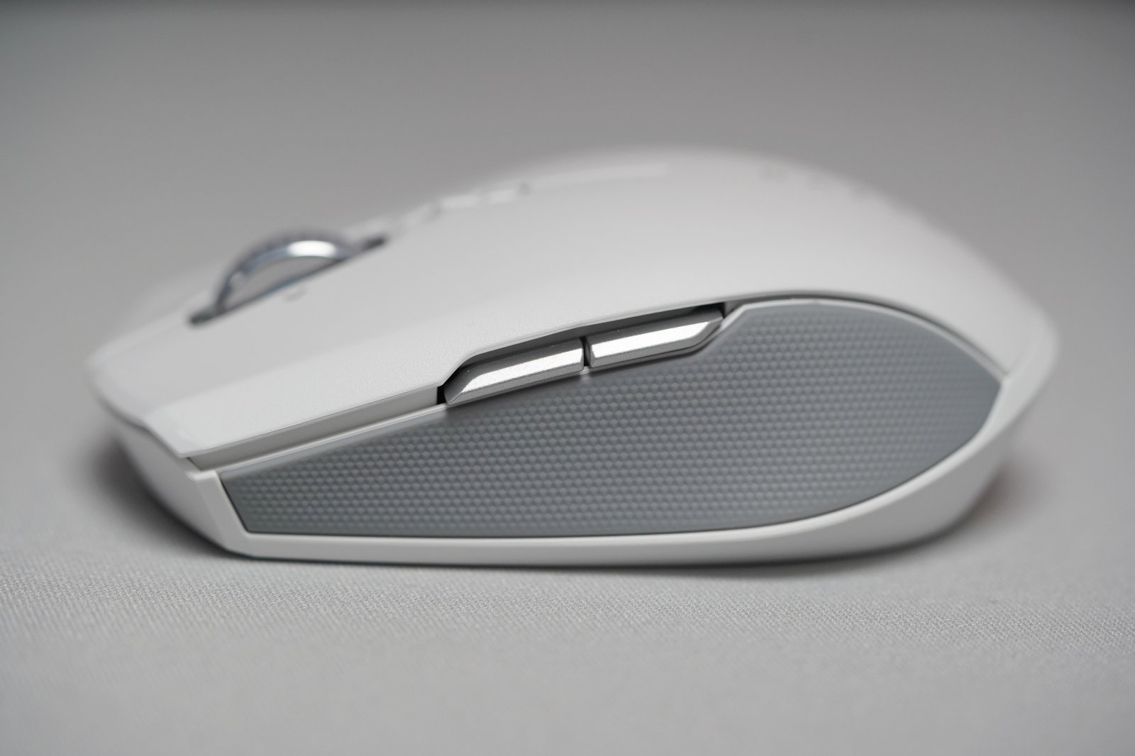 Z lewej strony myszki mamy dwa przyciski, które pozwalają nam przejść np. do kolejnej strony (górny) lub wrócić do poprzedniej (dolny). Na szczycie myszki mamy jeszcze jeden przycisk kołyskowy, który zmienia zachowanie się rolki – gdy jest poziomo czuć pod palcem każde przesunięcie rolki, natomiast gdy jest w dół – rolka działa swobodnie, bez żadnego ogranicznika. Tuż obok niego znajduje się dioda, która – gdy myszka zaczyna się rozładowywać (stan naładowania baterii spada poniżej 5%) – świeci na czerwono.