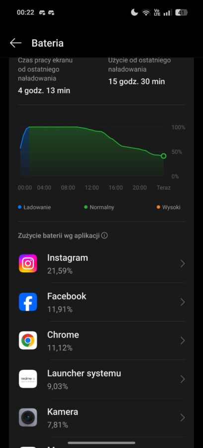 Standardowo pod koniec dnia na WiFi potrafię mieć zapas 50%, podczas gdy SoT wynosi 4h. Na danych mobilnych też nie udało mi się rozładować go w jeden dzień – kończyłam dni z SoT na poziomie 3-4 h, mając jeszcze zapas energii 20, a nawet sporo więcej procent. W trybie mieszanym udało się nawet przekroczyć 5h SoT i dzień zakończyć z zapasem 33%.