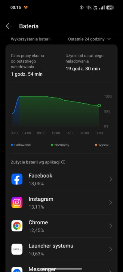 Raz, pewien bardzo spokojny weekend, postanowiłam pociągnąć cykl baterii do trzeciego dnia, kończąc pierwszy z zapasem 69% i wynikiem 1h52’ SoT, a drugi – odpowiednio – 32% i 3h48’. Ostatecznie telefon skapitulował po godzinie 14 trzeciego dnia, zapewniając łączny SoT na poziomie 5h15’.