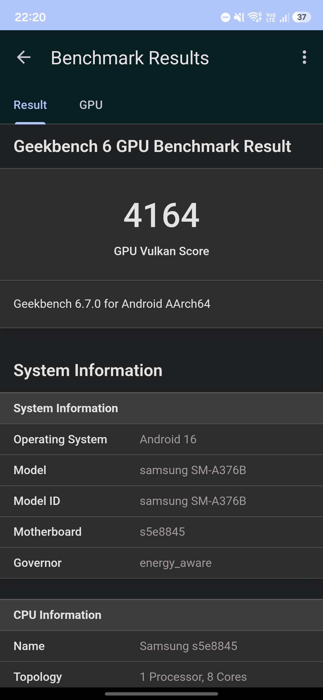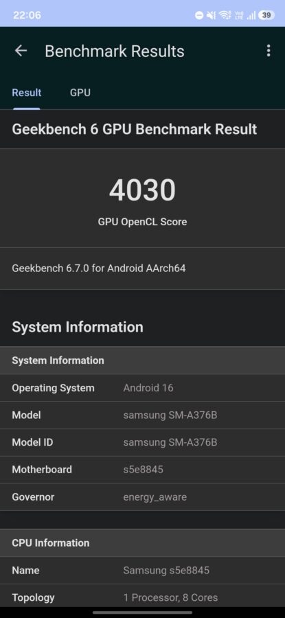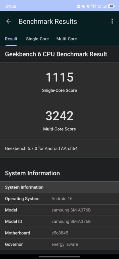 Z kolei za wydajność Samsunga Galaxy A37 odpowiada starszy Exynos 1380 (4 nm, do 2.75 GHz) z grafiką Xclipse 530 w kooperacji z 6 GB RAM LPDDR5X oraz 128 GB pamięci wewnętrznej UFS 3.1. W zasadzie to tutaj widać większe różnice niż w droższym bracie, bo zeszłoroczny Galaxy A36 wykorzystywał wówczas Snapdragona 6 Gen 3, RAM LPDDR4 i pamięć UFS 2.2.