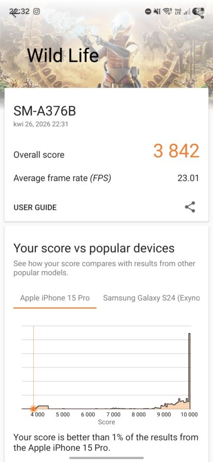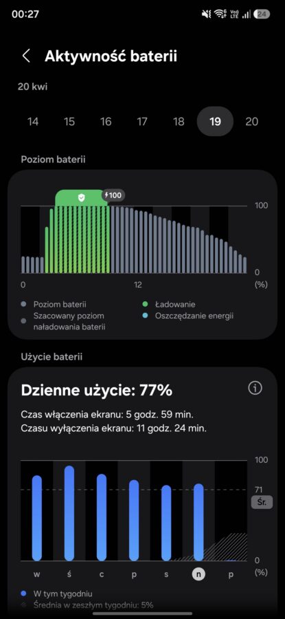 Z kolei Samsung Galaxy A37, mimo że często też był w stanie wytrzymać do późnego wieczora, to i tak kończył dzień z wynikami SoT (czyli czasem włączonego ekranu) o około godzinę niższymi od Galaxy A57, nawet w cyklach z przeważającym użyciem WiFi.