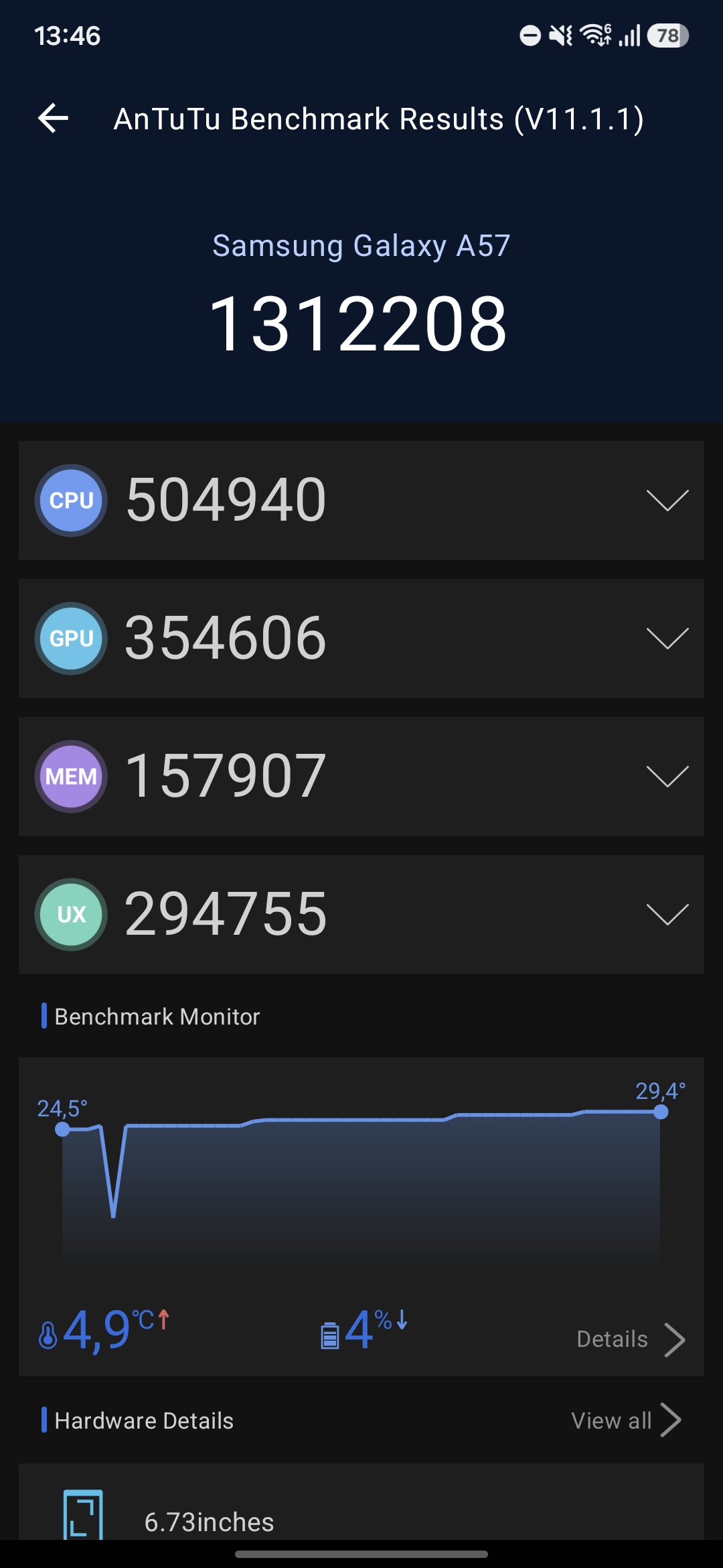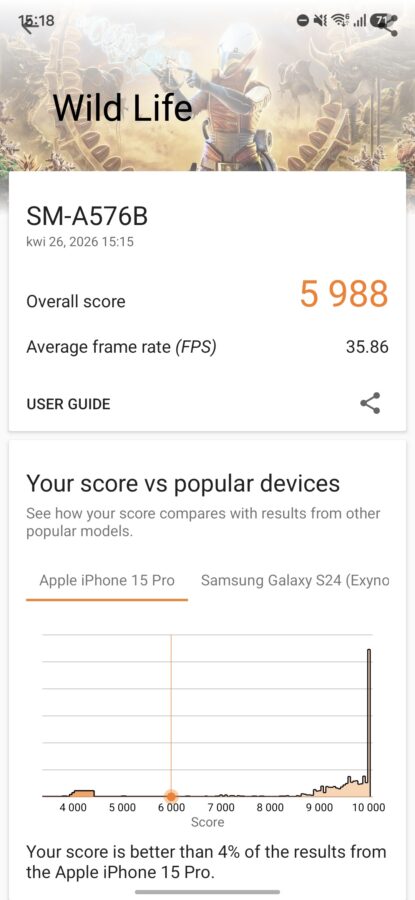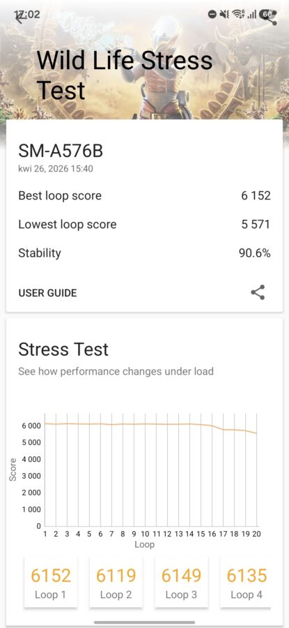 Skoro już wspominam o SoT-ach, to wypada przytoczyć te wyniki w całości. Galaxy A57 w cyklu mieszanym osiągał średnio 6 godzin SoT, a niekiedy zbliżał się do 6,5 godziny. Gdy więcej było użycia 5G, mogłem liczyć raczej na trochę ponad 4,5 godziny.