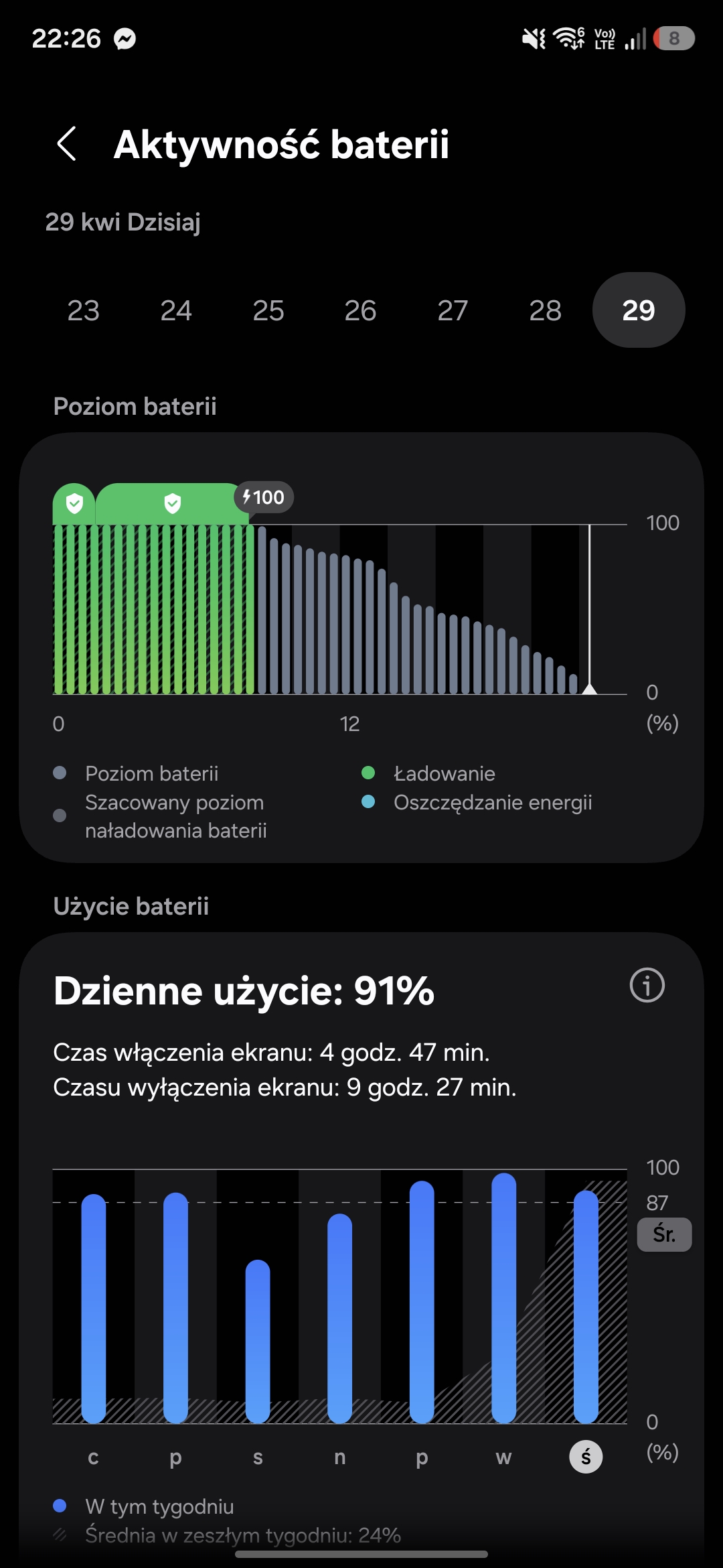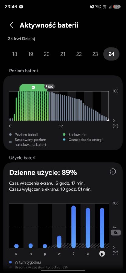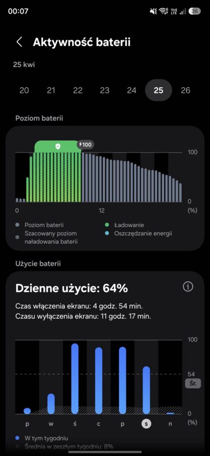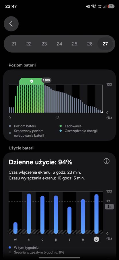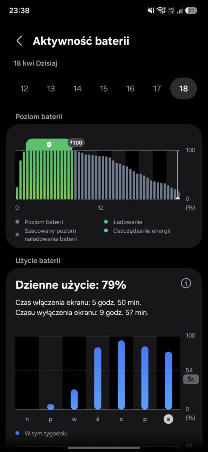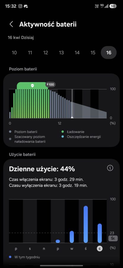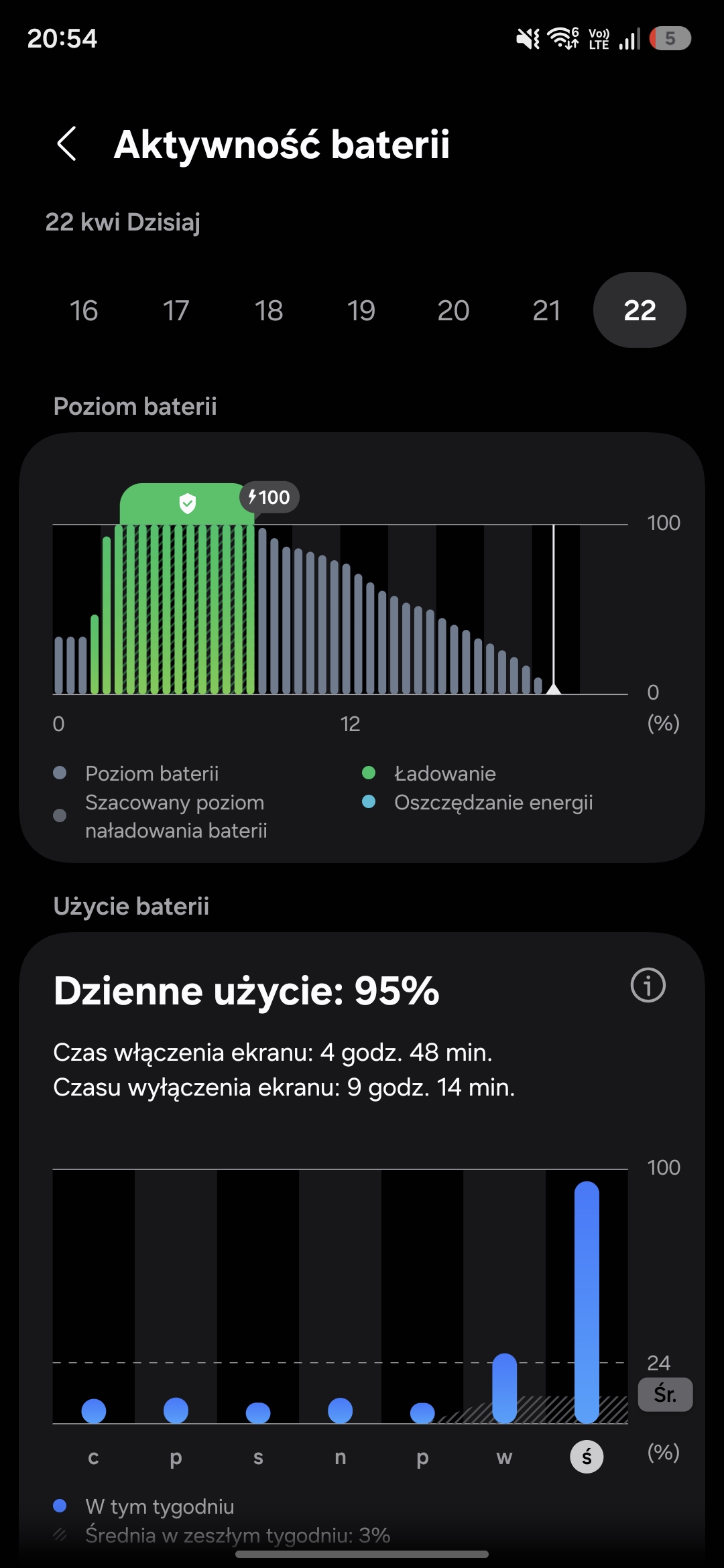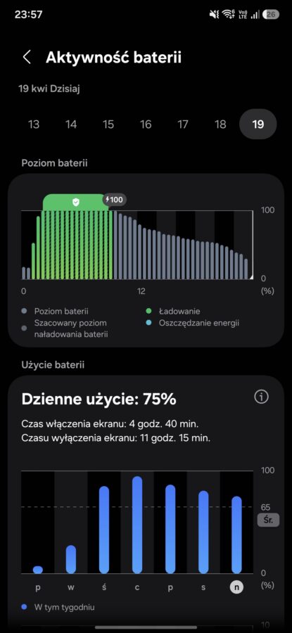 Na obu urządzeniach zrobiłem niemal identyczną ilość cykli, co daje mi właściwy ogląd na różnice między nimi. Samsung Galaxy A57 względem tańszego Galaxy A37 uzyskiwał w moich rękach nie tylko lepsze wyniki czasu na włączonym ekranie w różnych warunkach, ale i często kończył cykle o późniejszej godzinie, nierzadko też z większym zapasem energii.