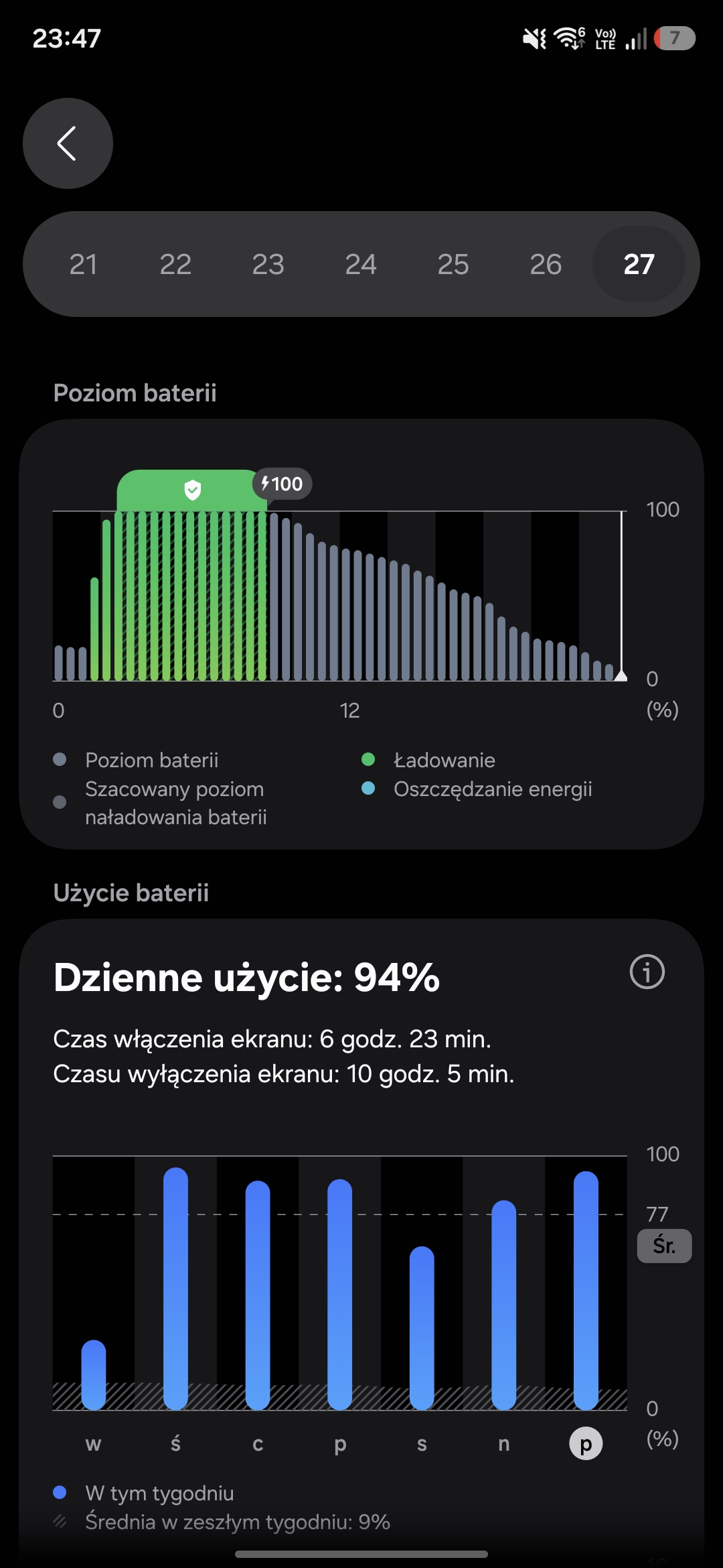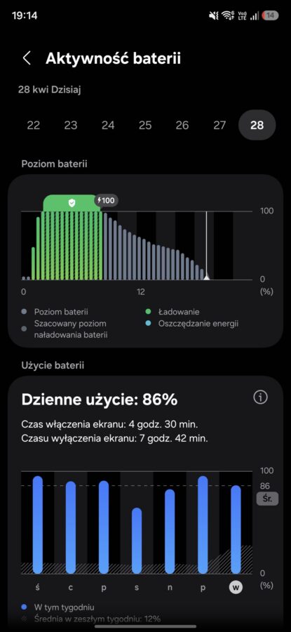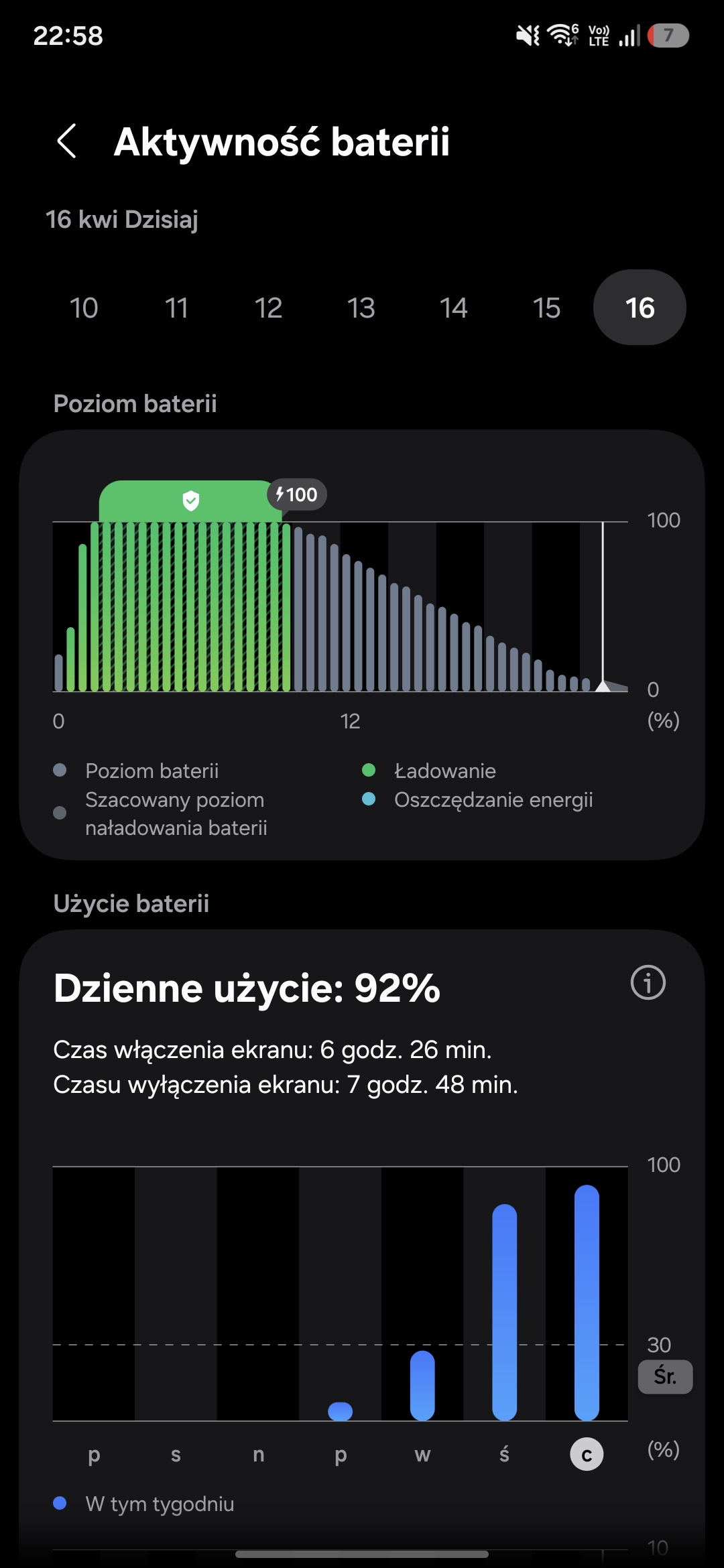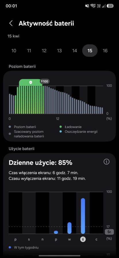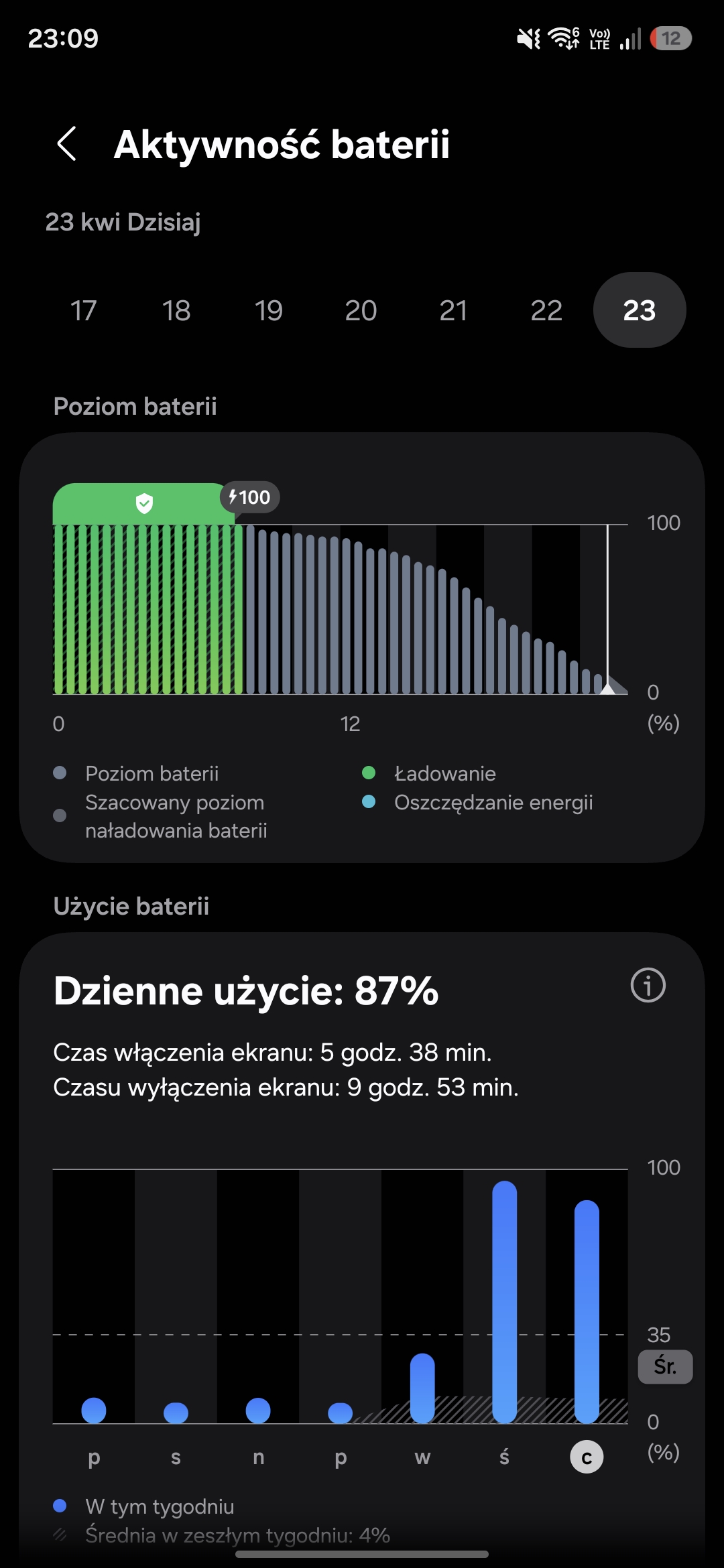 Na obu urządzeniach zrobiłem niemal identyczną ilość cykli, co daje mi właściwy ogląd na różnice między nimi. Samsung Galaxy A57 względem tańszego Galaxy A37 uzyskiwał w moich rękach nie tylko lepsze wyniki czasu na włączonym ekranie w różnych warunkach, ale i często kończył cykle o późniejszej godzinie, nierzadko też z większym zapasem energii.