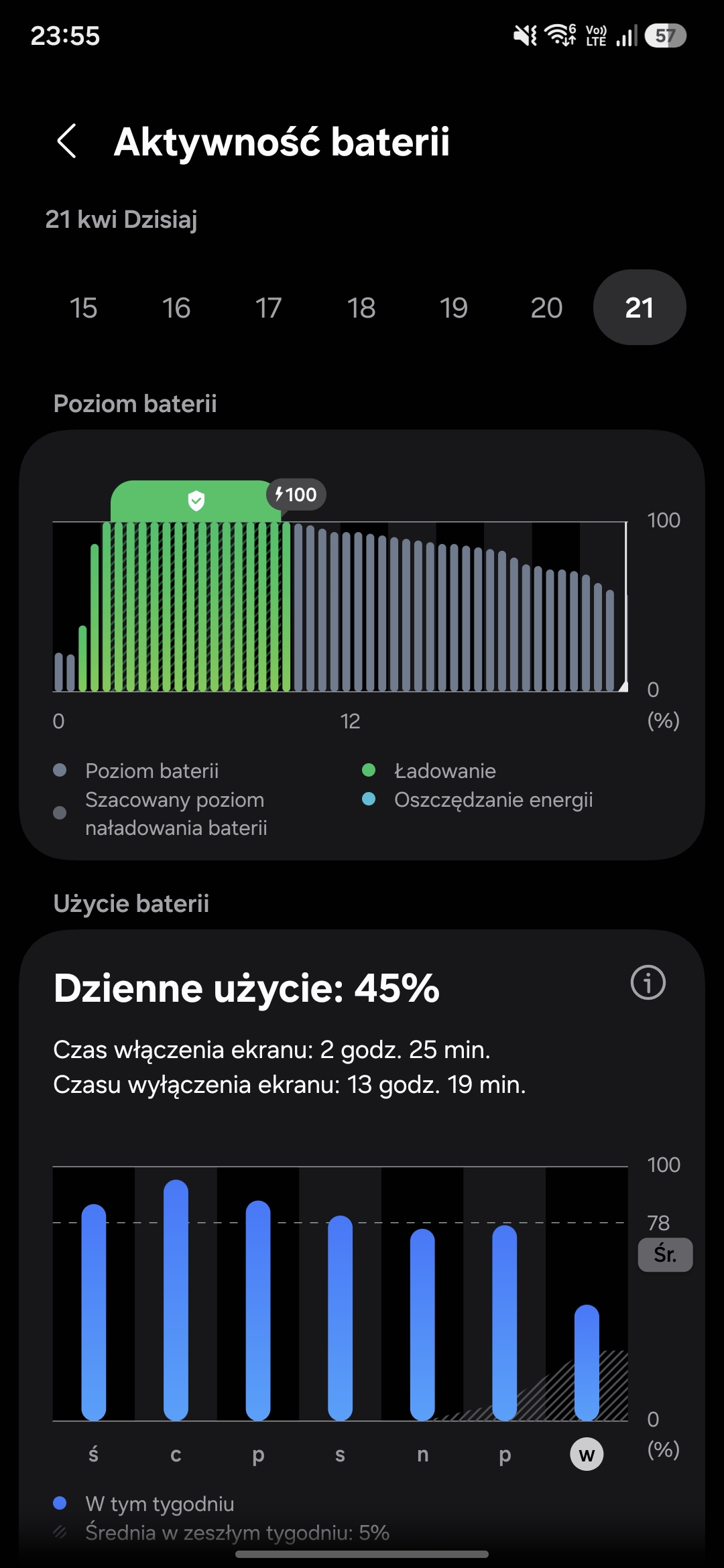 Z moich obserwacji wynika bowiem, że Galaxy A57 traci mniej energii, gdy leży nieużywany. Sprawia to, że nawet, jeśli korzystamy z niego relatywnie intensywnie, to spokojnie jest w stanie dociągniąć do bardzo późnego wieczora, mając jeszcze 20-25% zapasu baterii. Raz, przy rzadszym użytkowaniu (niecałe 2,5 godziny na ekranie), udało mi się nawet skończyć dzień mając jeszcze aż 57%, co pozwoliło mi na korzystanie z niego jeszcze następnego dnia.