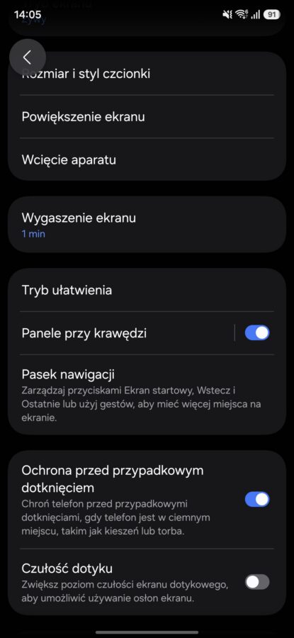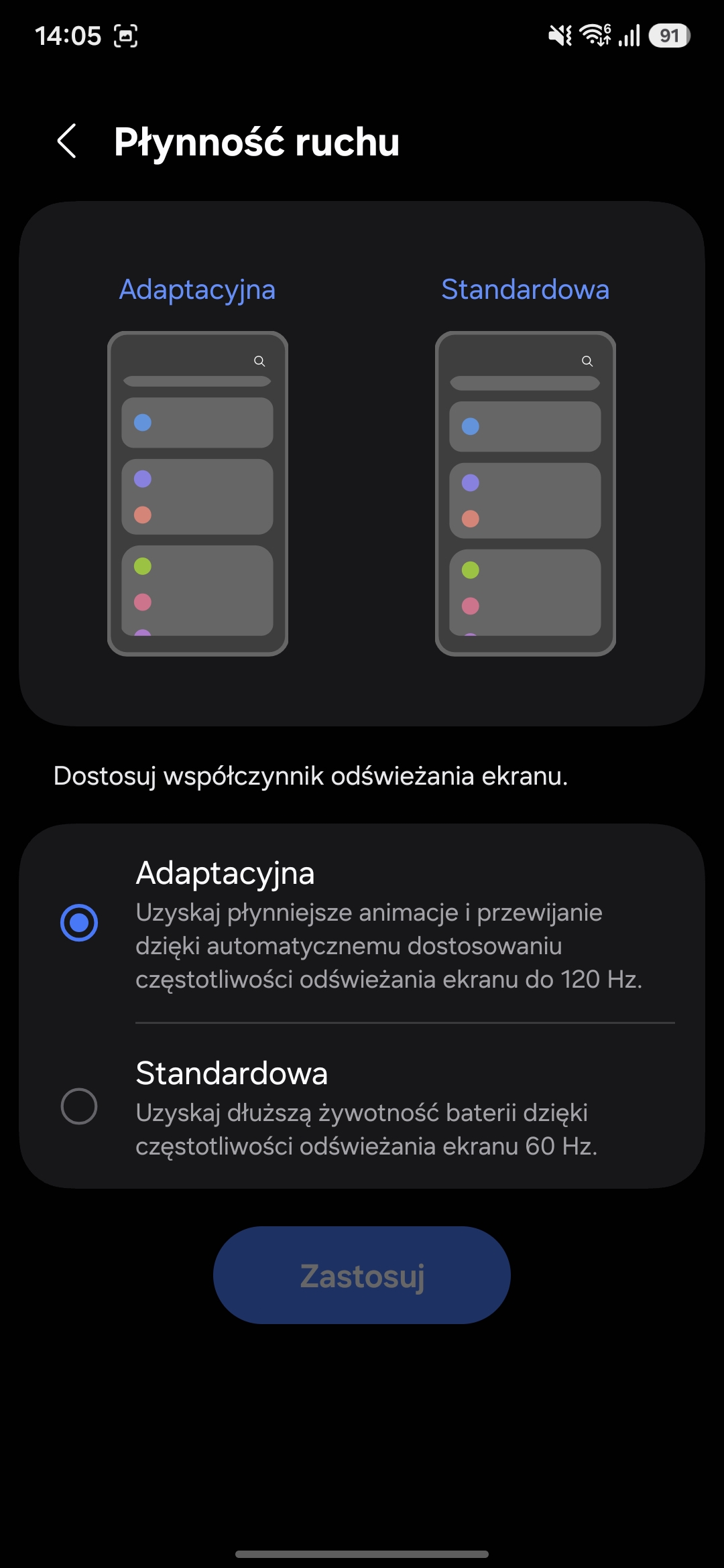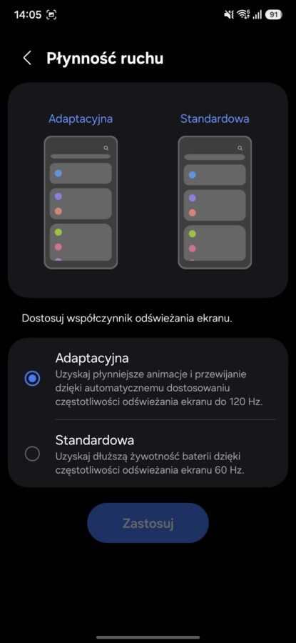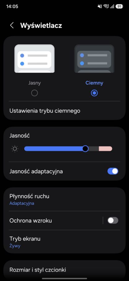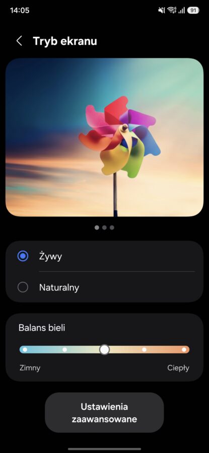 Sekcja ustawień wyświetlacza wygląda podobnie jak w innych smartfonach Samsunga i umożliwia nam na wybór jednego z dwóch trybów wyświetlania kolorów – żywy lub naturalny, a także dostosowanie balansu bieli.