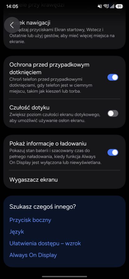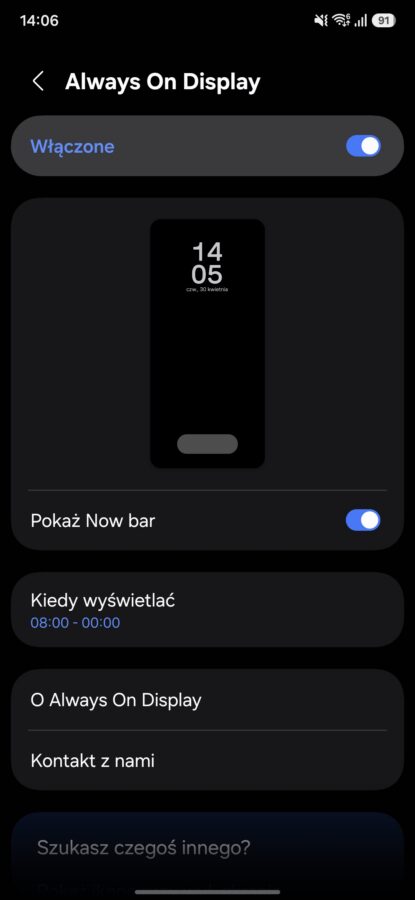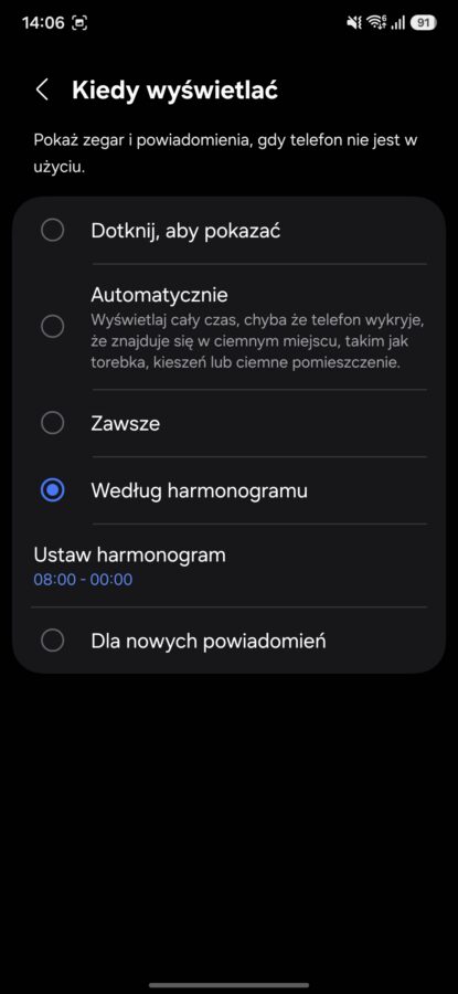 Na pokładzie obu modeli mamy również funkcję Always On Display, choć oczywiście (bez zaskoczenia) w uboższej wersji, czyli bez opcji wyświetlania z przygaszoną tapetą, a jedynie na czarnym tle. Pokazują się tu jednak wszystkie kluczowe informacje, zaś całość może być widoczna zawsze, według harmonogramu godzinowego, po dotknięciu ekranu, pojawieniu się nowego powiadomienia lub automatycznie. W ostatniej opcji telefon wygasza AoD po wykryciu, że znajduje się np. w ciemnym pomieszczeniu albo torbie.