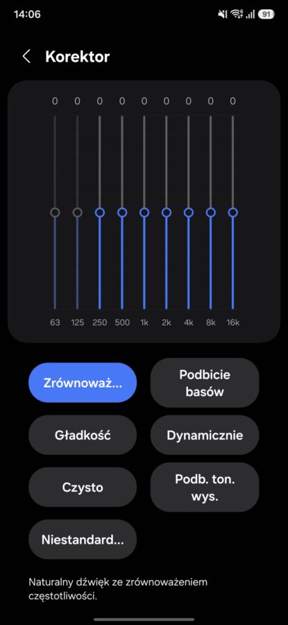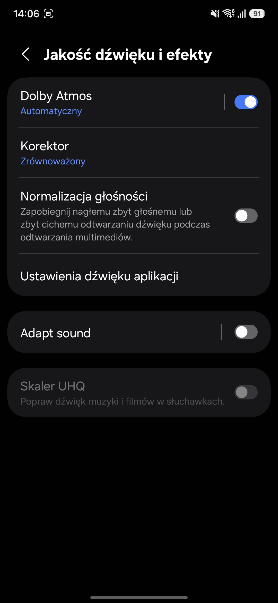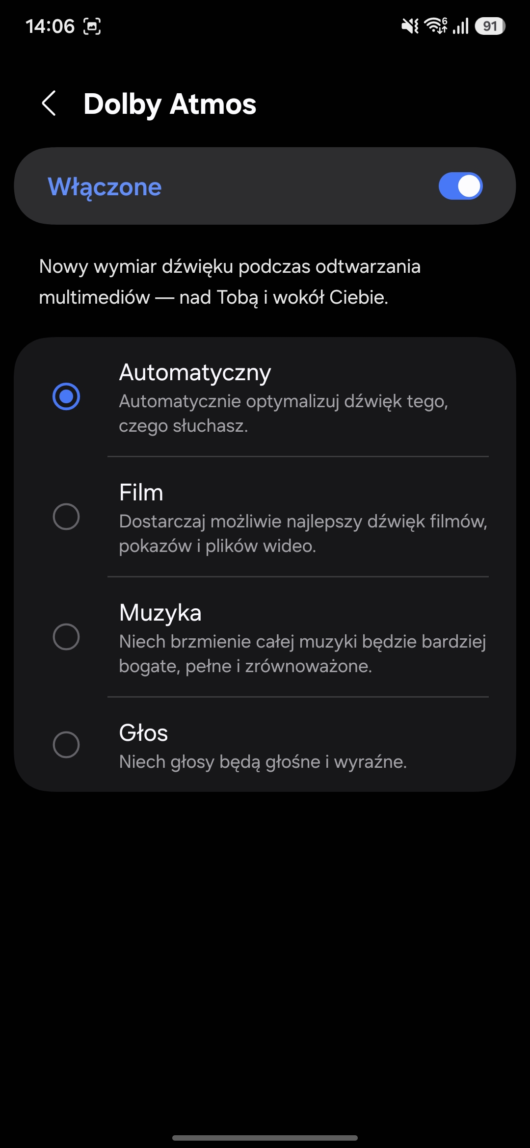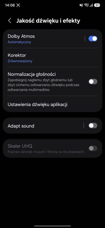 Tak jak w innych smartfonach Samsunga, tu również mamy wsparcie dla dźwięku przestrzennego Dolby Atmos. Stosowne opcje znalazły się w ustawieniach telefon – pozwalają nam one włączyć lub wyłączyć Dolby Atmos, wybrać dla niego jeden z czterech profili brzmienia, a dodatkowo także dostosować equalizer z korektorem graficznym i gotowymi presetami. W zasadzie niczego tu nie brakuje.