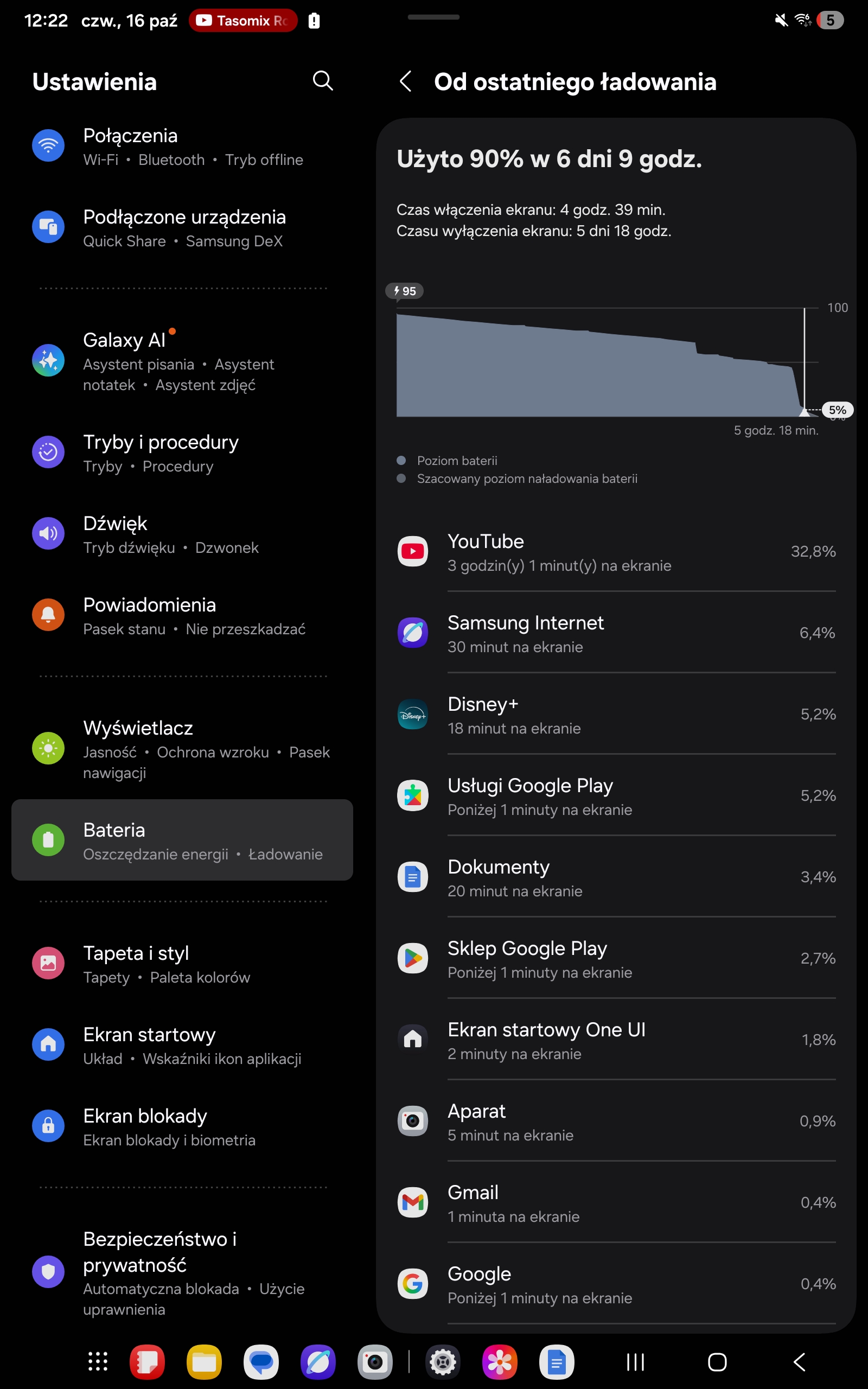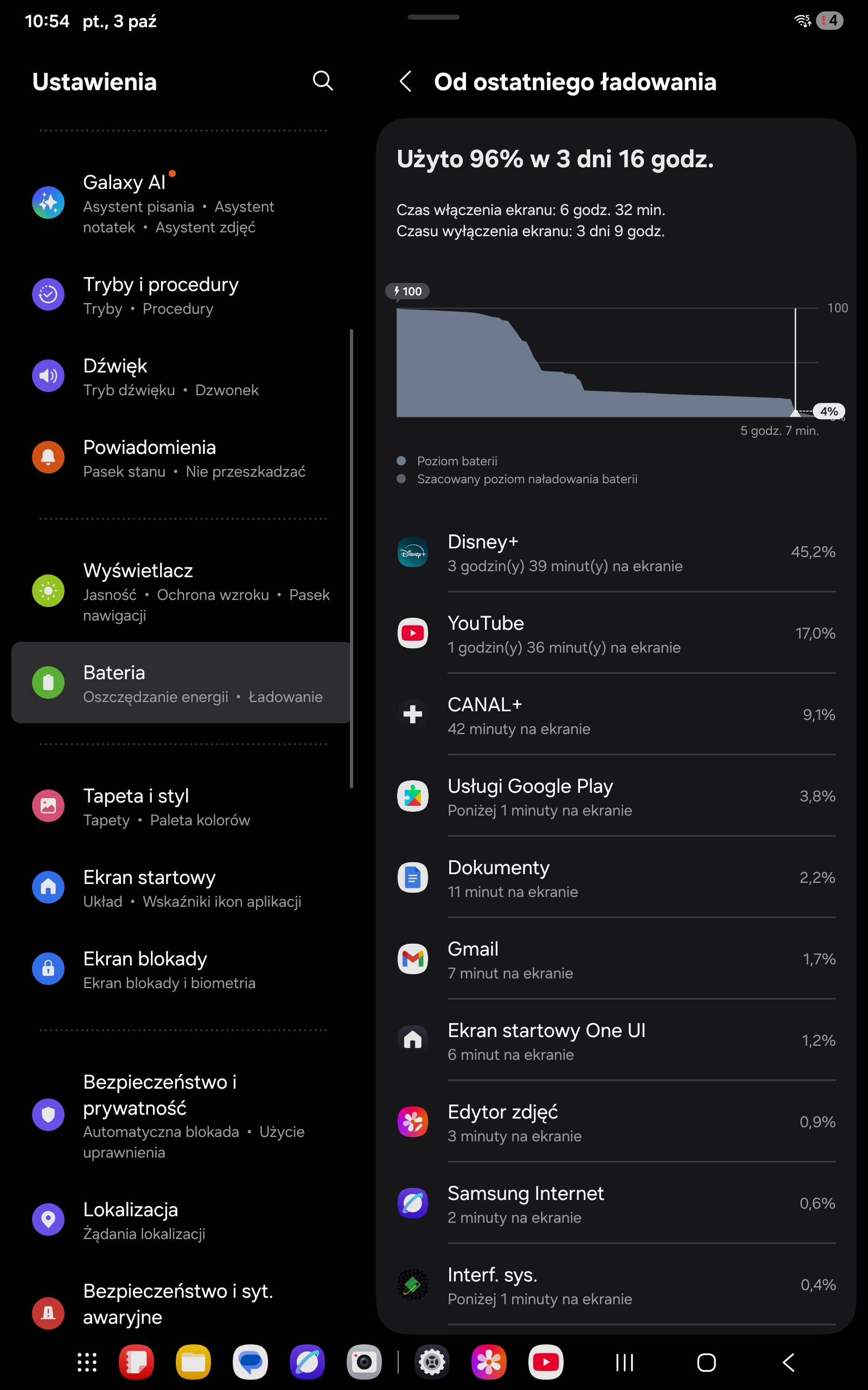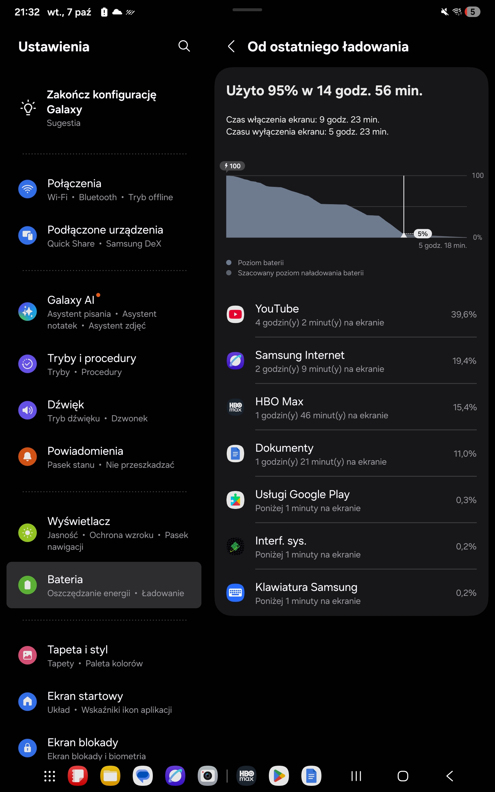 Jeśli już chodzi o czas pracy na jednym pełnym ładowaniu, to do zachwytów z recenzji Samsunga Galaxy Tab S9 Ultra 5G mi daleko, ale nadal trudno mówić o ogromnym rozczarowaniu. Średnio tablet ładowałem co około 3-4 dni, korzystając z niego po kilka godzin dziennie.