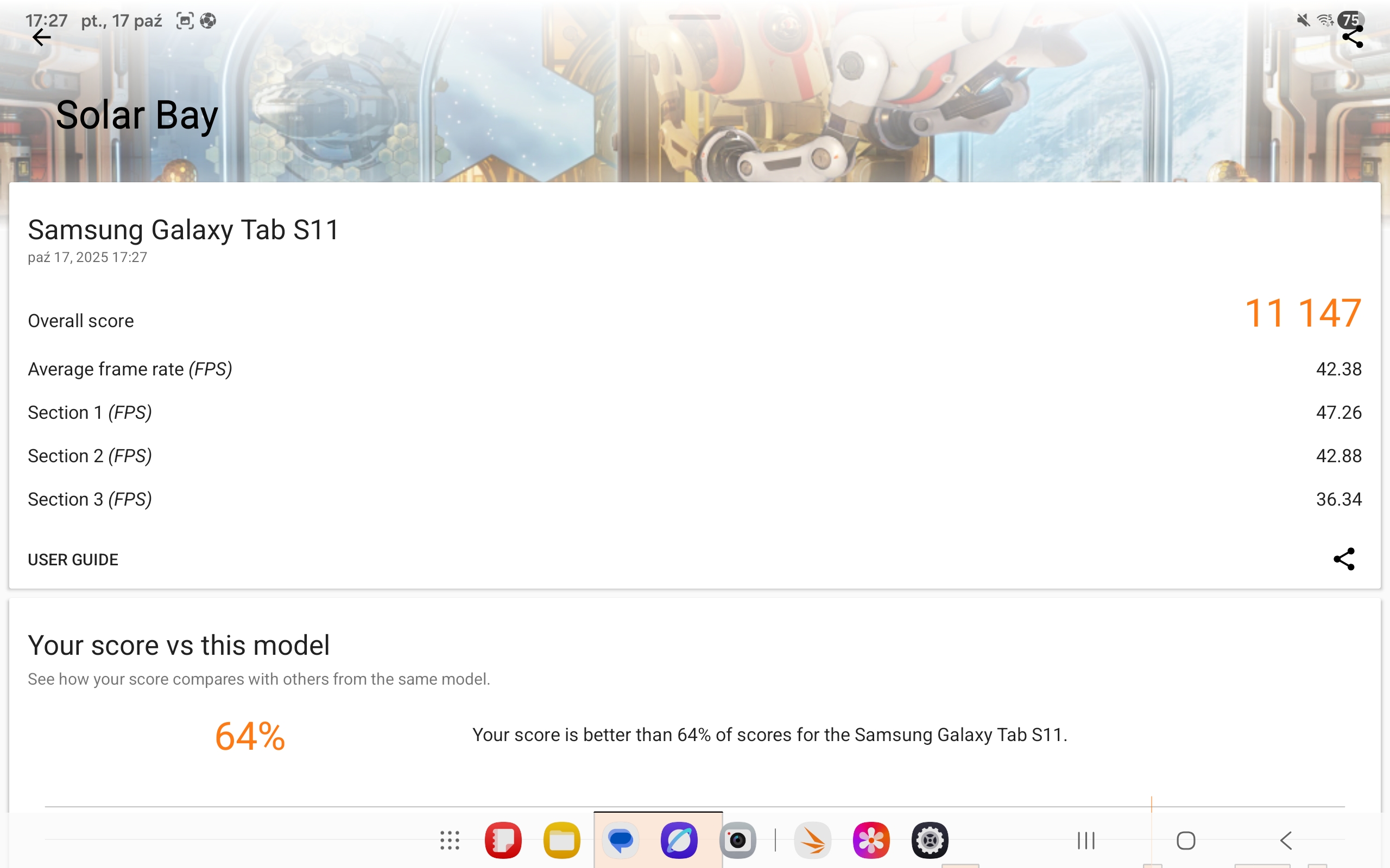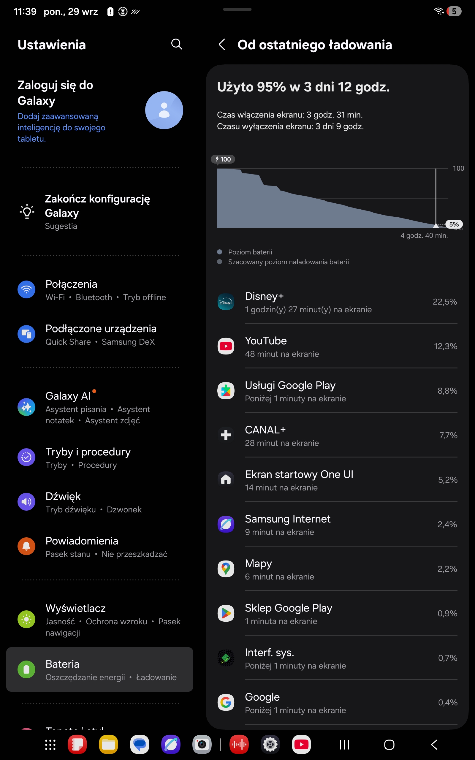 Przez prawie trzy tygodnie testów, recenzowany tablet ładowałem zaledwie 6 razy, co było spowodowane moją mniejszą ilością czasu wolnego, jak i solidnym (choć nie rekordowo dobrym) czasem pracy na baterii Samsunga Galaxy Tab S11.
