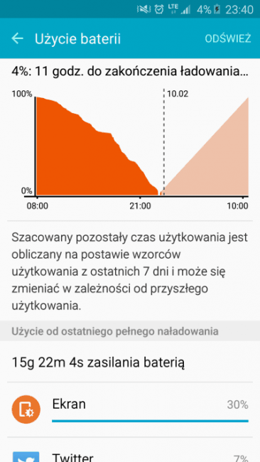 Średni czas działania telefonu, jaki udało mi się uzyskać podczas testów, to 2 dni (odłączenie od ładowarki rano, podłączenie popołudniu/wieczorem dnia następnego), z czego 5,5-6 godzin na włączonym ekranie. Oznacza to, że nawet w rękach osoby bardzo mocno eksploatującej smartfon, Galaxy A5 będzie wytrzymywał pełny dzień pracy (u mnie np. 5 godzin SoT, w większości na LTE, przy 15 godzinach działania). To bardzo dobry wynik, którego nie jest w stanie osiągnąć Galaxy S6…