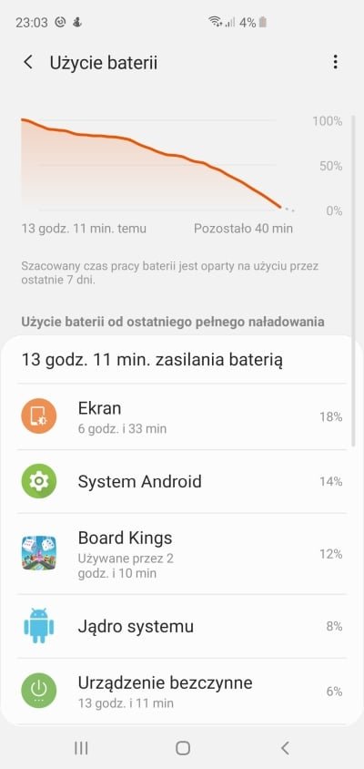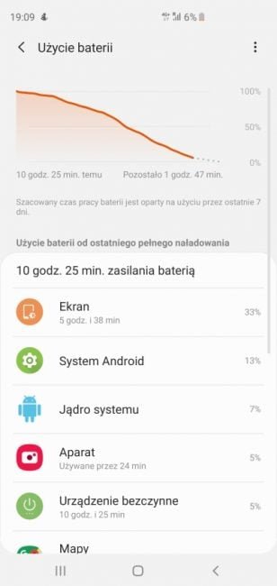 Mając stale włączony GPS i podłączonego Galaxy Watcha na Bluetooth, korzystając z danych mobilnych czas pracy testowanego telefonu wynosił od 3,5 do 5 godzin na włączonym ekranie przy 8-13 godzinach pracy. Jak spojrzycie na screeny załączone przeze mnie poniżej, zauważcie, że momentami można odnieść wrażenie, że Galaxy S10+ ma ustawiony limiter działania do 4 godzin i 40 minut, bo to właśnie wyniki oscylujące wokół tych wartości były bardzo powtarzalne.